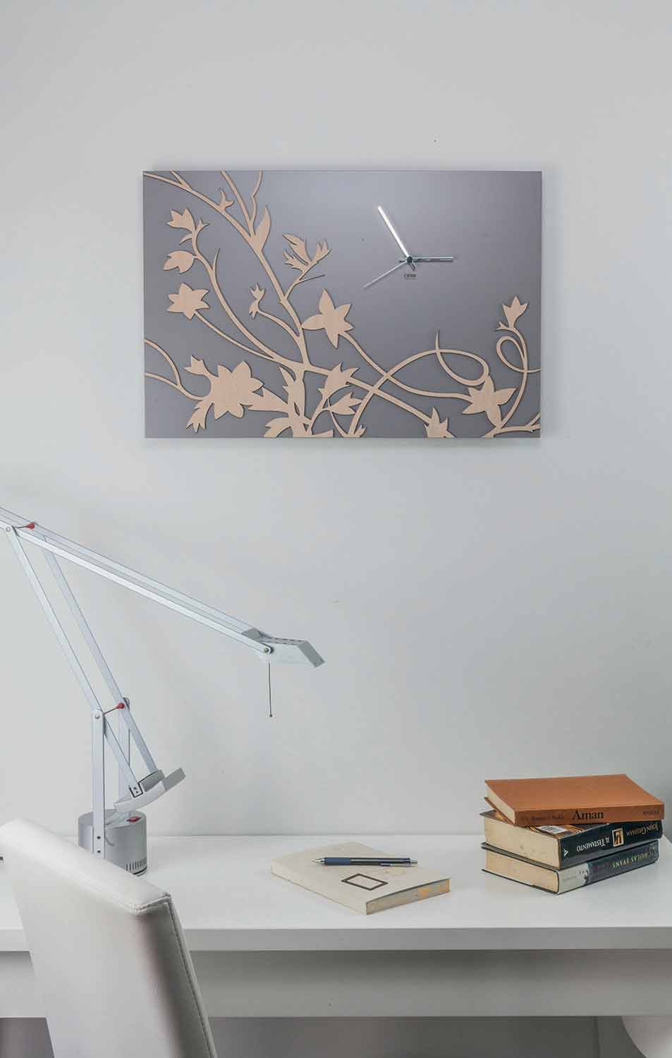 Large wall clock with a rectangular and modern design in grey and decorated wood, made in Italy.