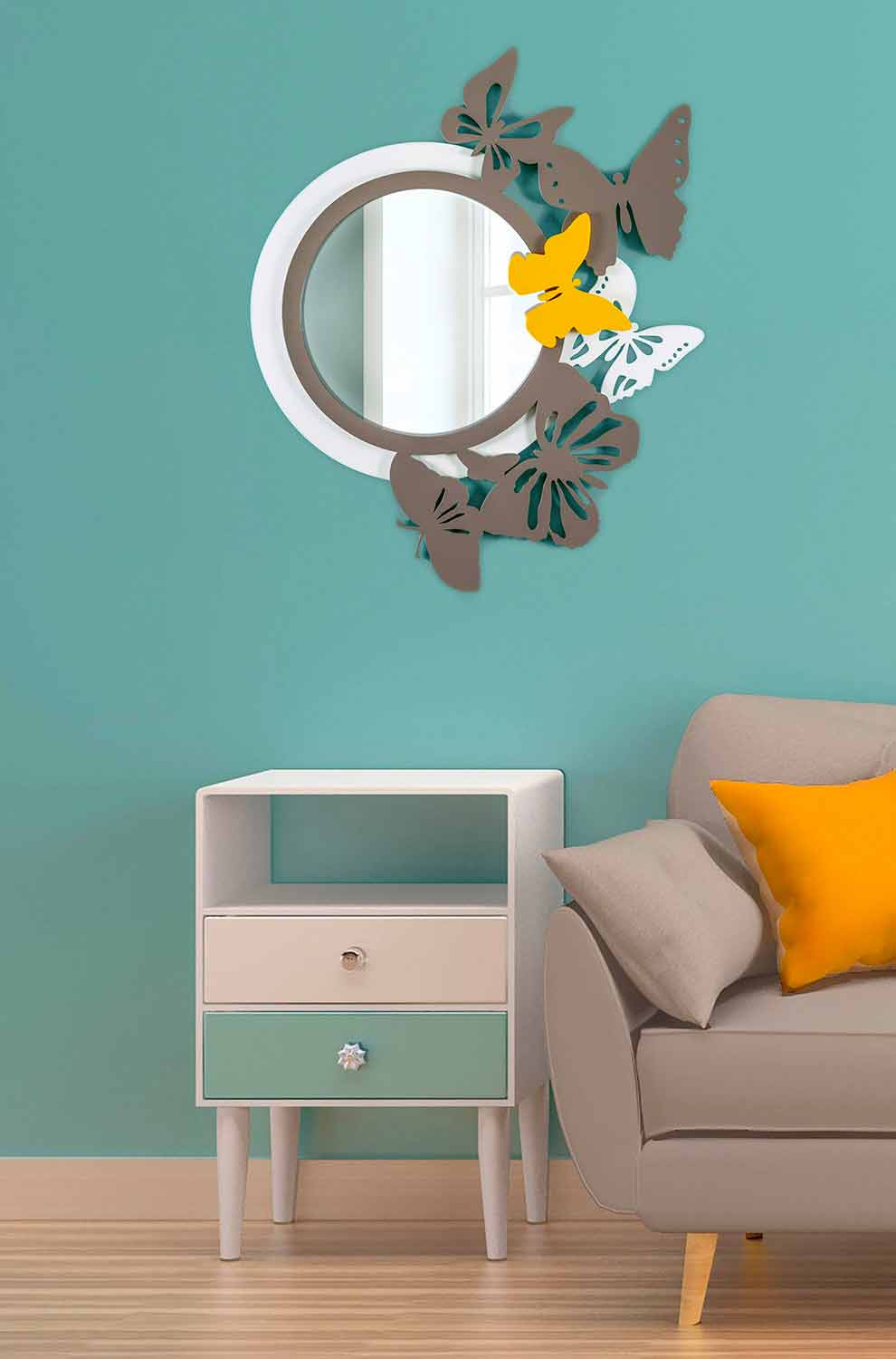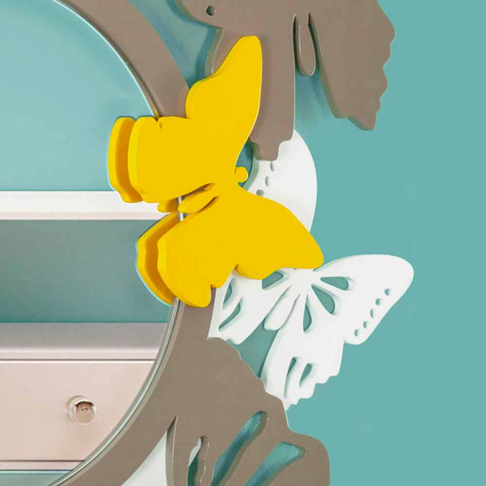 Modern and round wall mirror, in colored wood with decorative butterflies, made in Italy design.