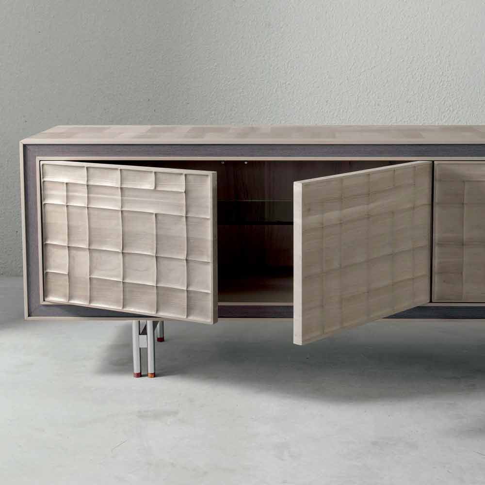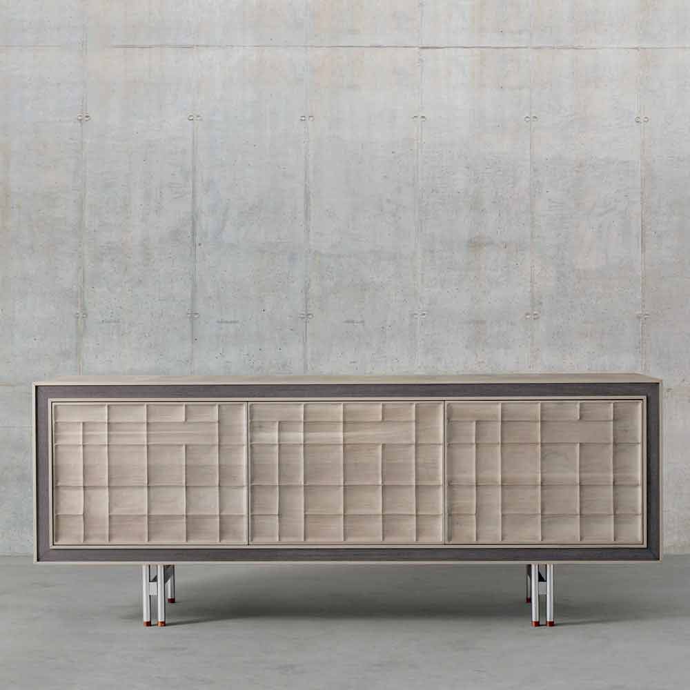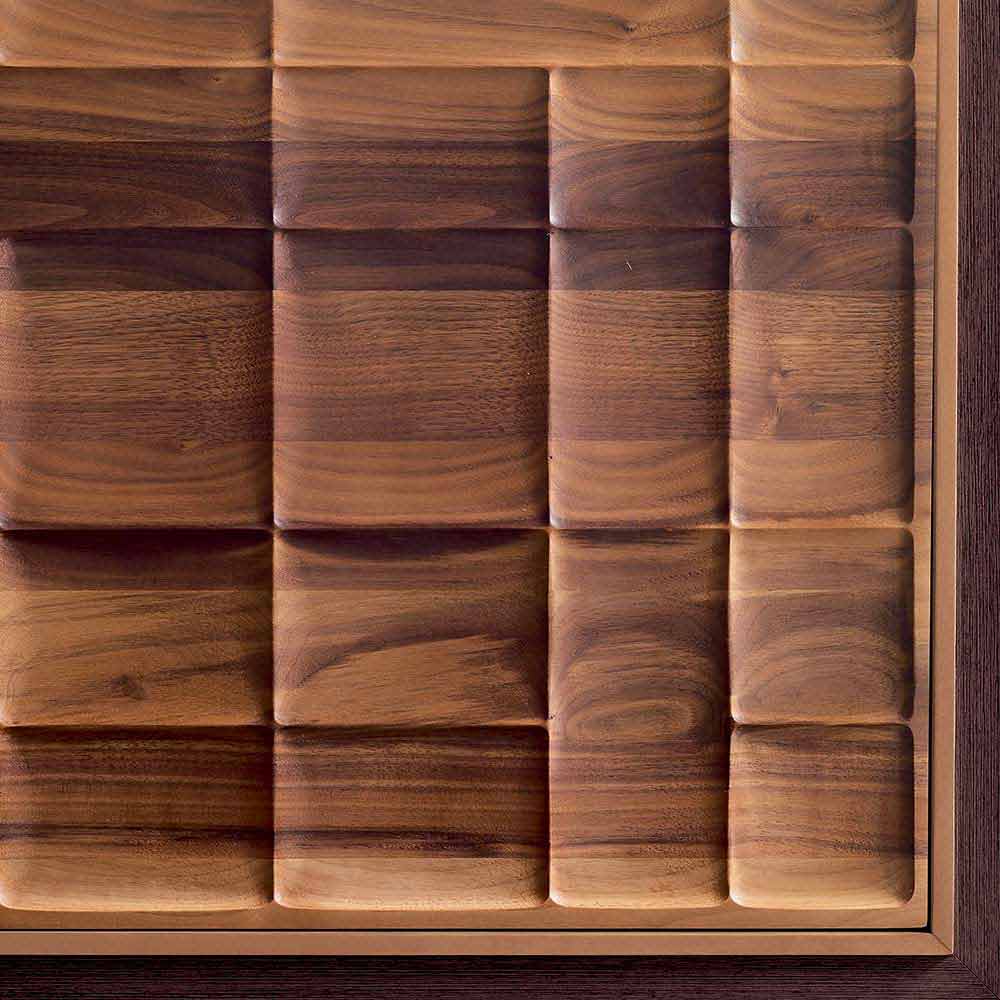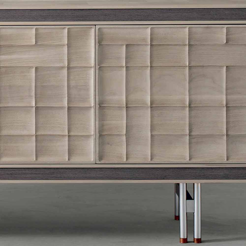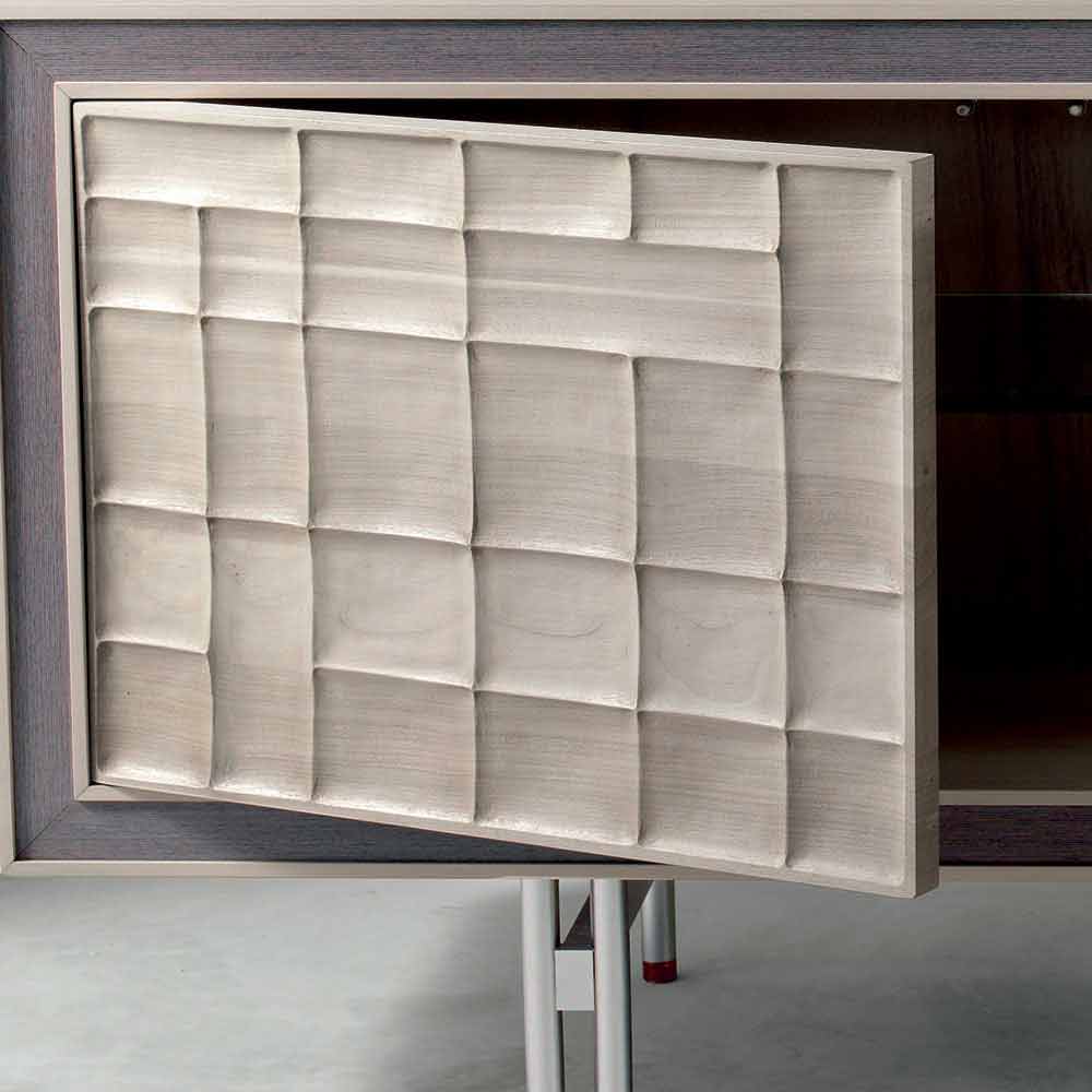 The play of light and shadow created by the particular processing of the doors takes up the traits of tradition to transform them into a work of contemporaneity. The walnut essence enhances the formal balance of the fine three-door sideboard.