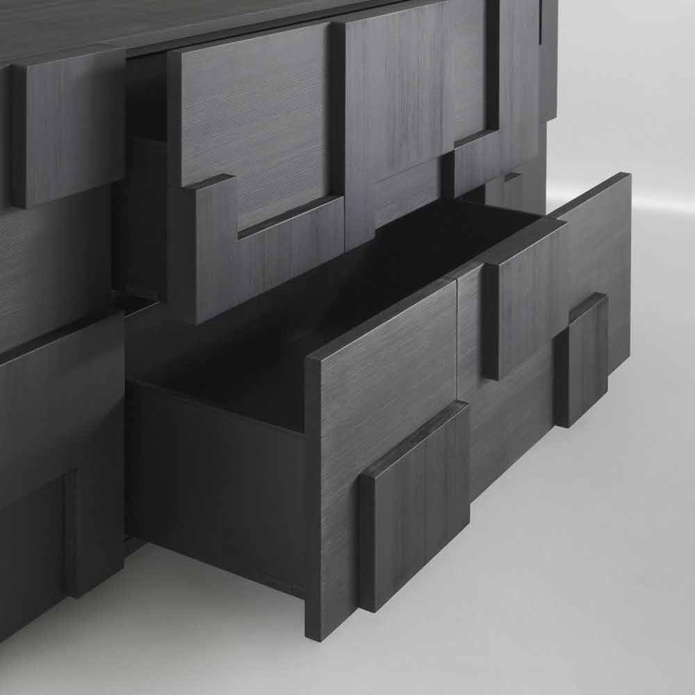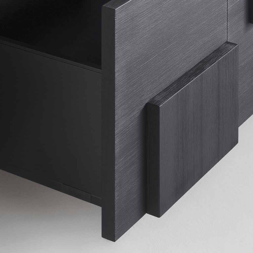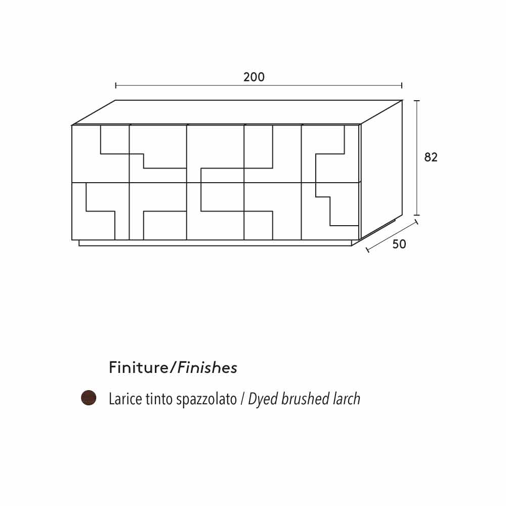 Lounge storage unit made of brushed thermo treated larch wood. It is provided with n°4 compartments ( n°2 doors and n°2 drawers). The inner shelves are made of lacquered MDF.