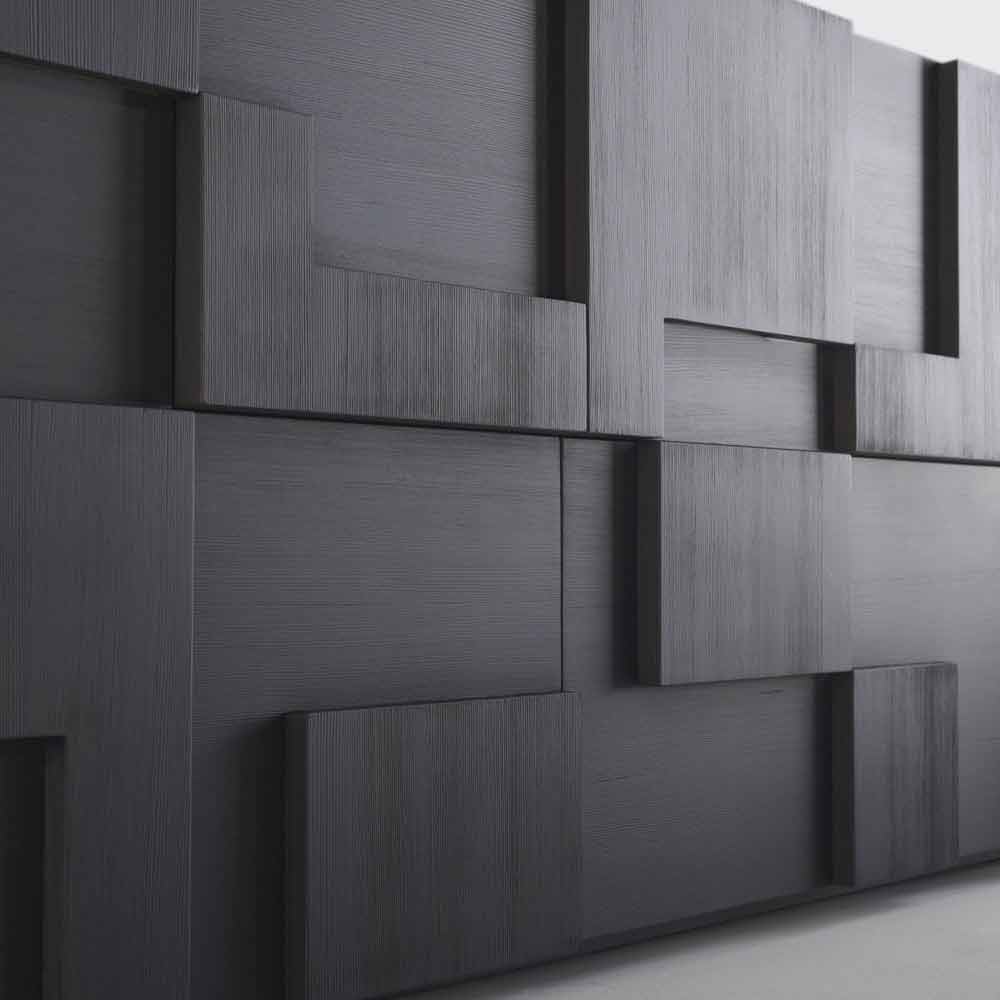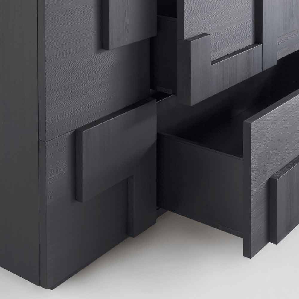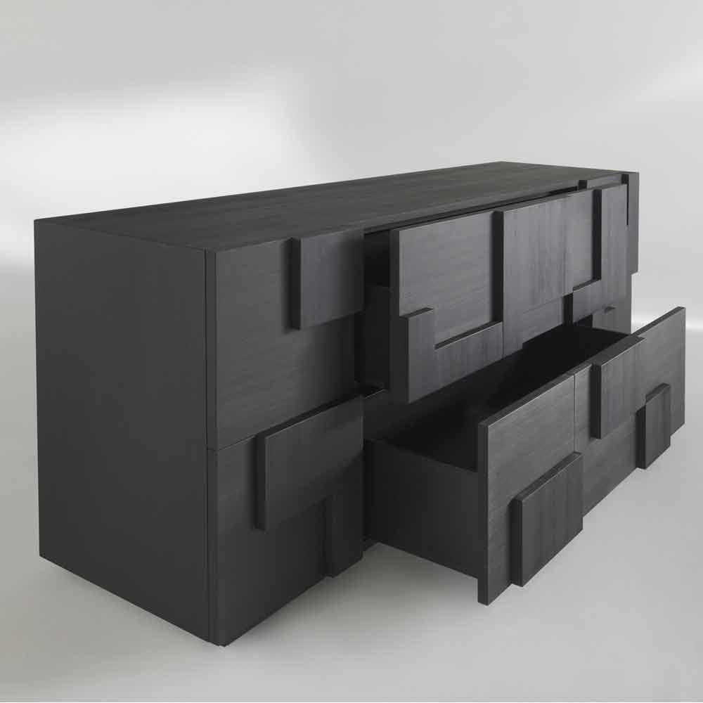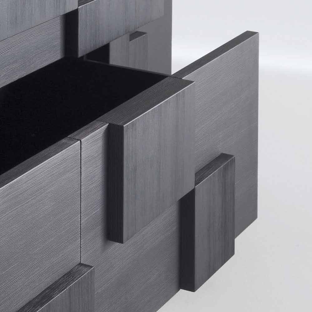 Lounge storage unit made of brushed thermo treated larch wood. It is provided with n°4 compartments ( n°2 doors and n°2 drawers). The inner shelves are made of lacquered MDF.