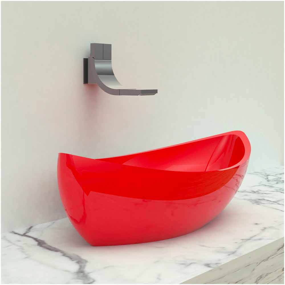 The concept of the Sashimi washbasin traces the same queues as the Funamori bathtub, a small wooden boat in which sushi and sashimi are served in Japanese restaurants.
