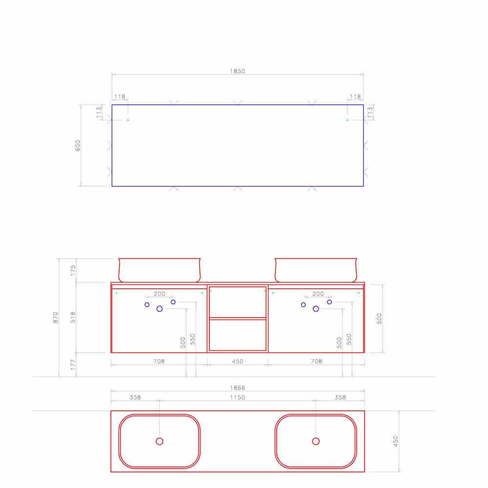 It is a contemporary and symmetrical composition, conceived with a double sink and wall unit separated by an open shelf that keeps the design clean and tidy.
