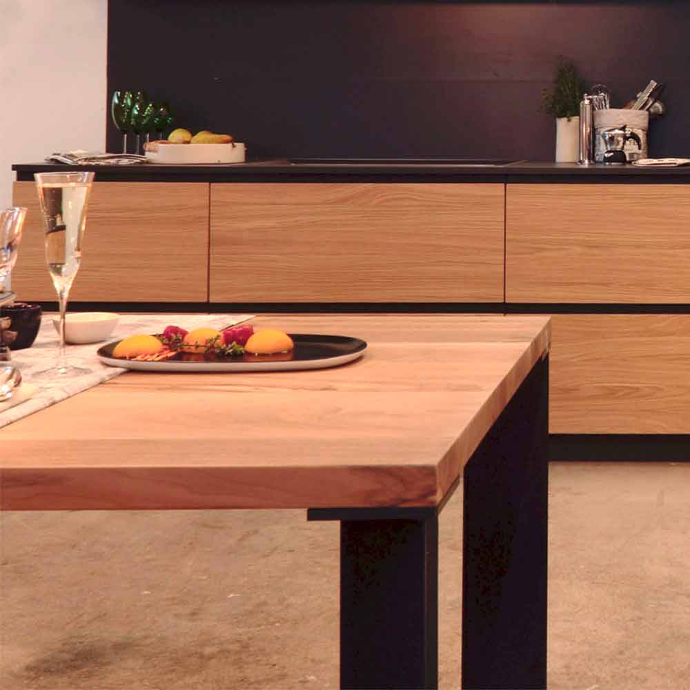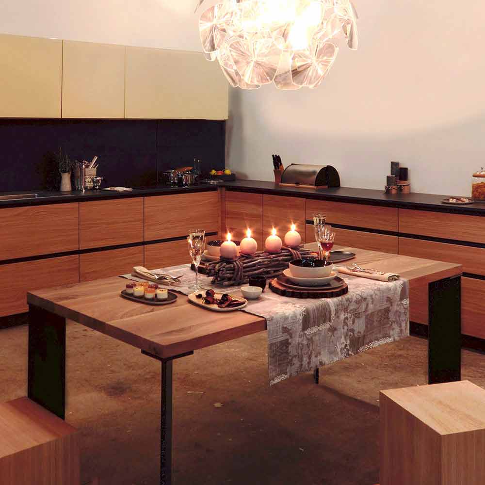 A table with essential queues that interprets the most basic geometry. The peculiar feature are the legs positioned diagonally, compared to the queues of the top. Decisive combinations between the simplicity and lightness of the shapes and the solidity of the material: solid national walnut and powder-coated metal.