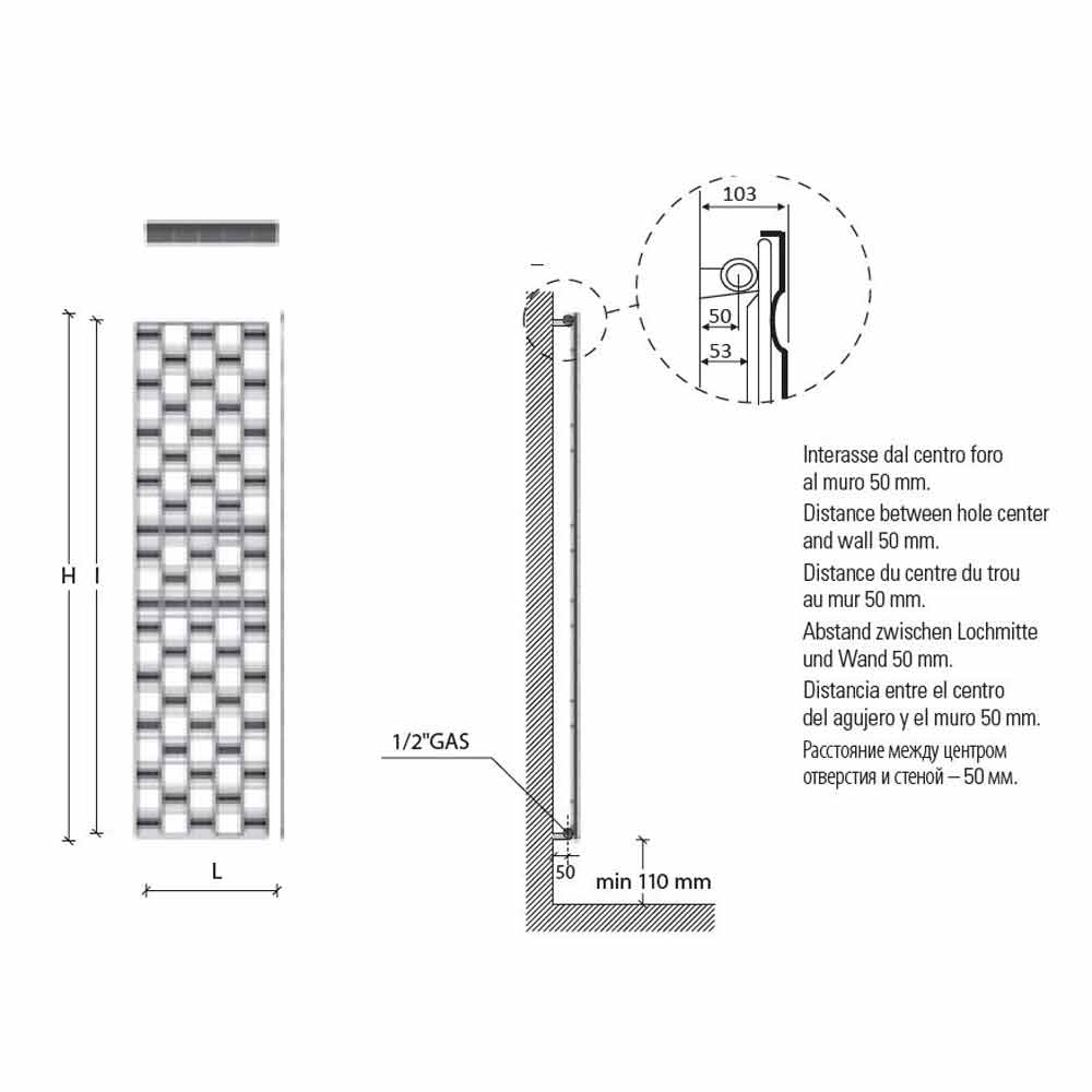 • H 1815 x L 503 x Inter. 1760 mm x Output w (Δt50 *) 815; Yield w (Δt30 *) 429; Yield w (Δt26 *) 358