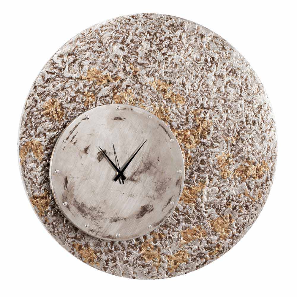 Eccli is an elegant wall clock on two levels, hand-decorated by hand with gold and silver leaf on materico material.