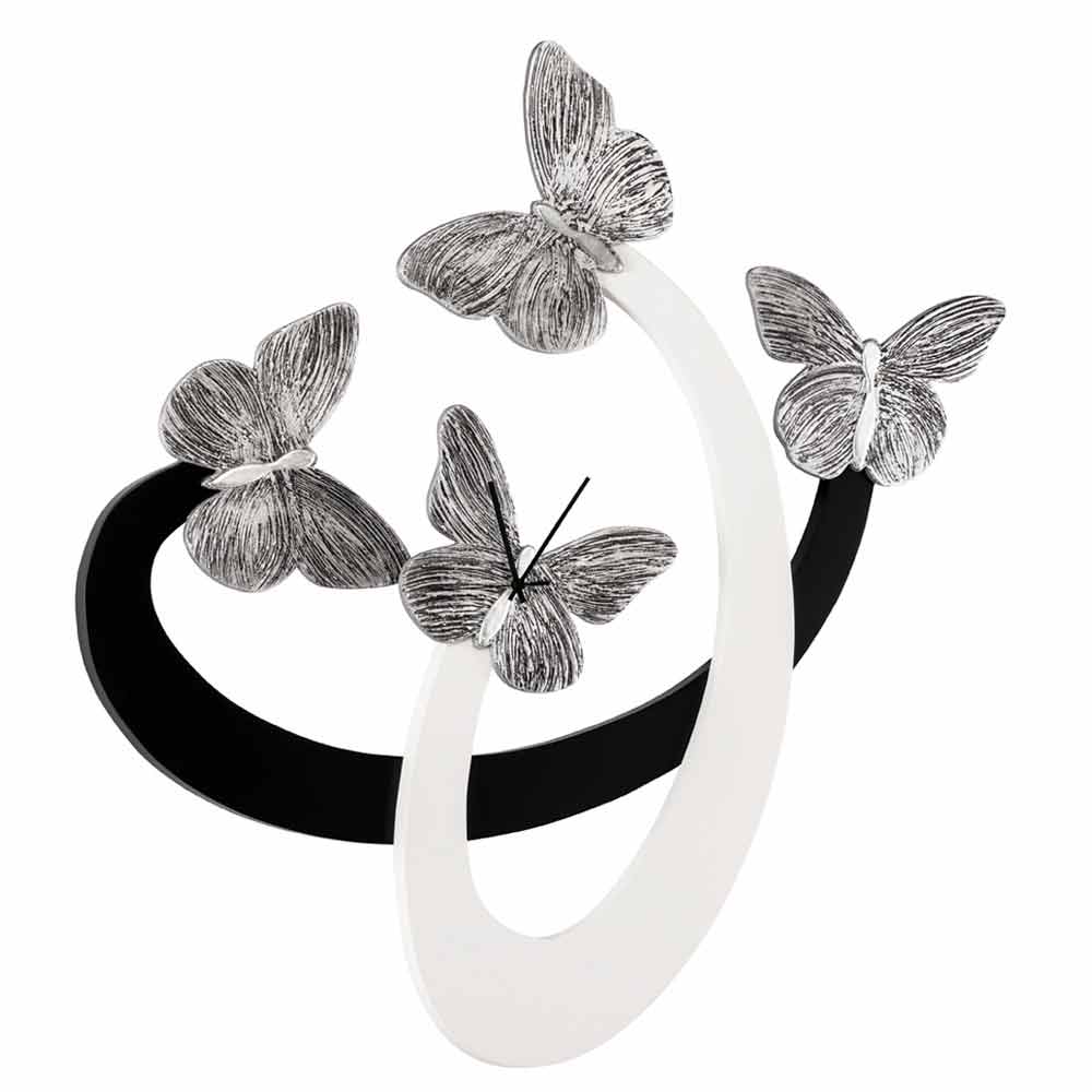 Wall clock Zenia with silver butterflies, ivory & black, made in Italy