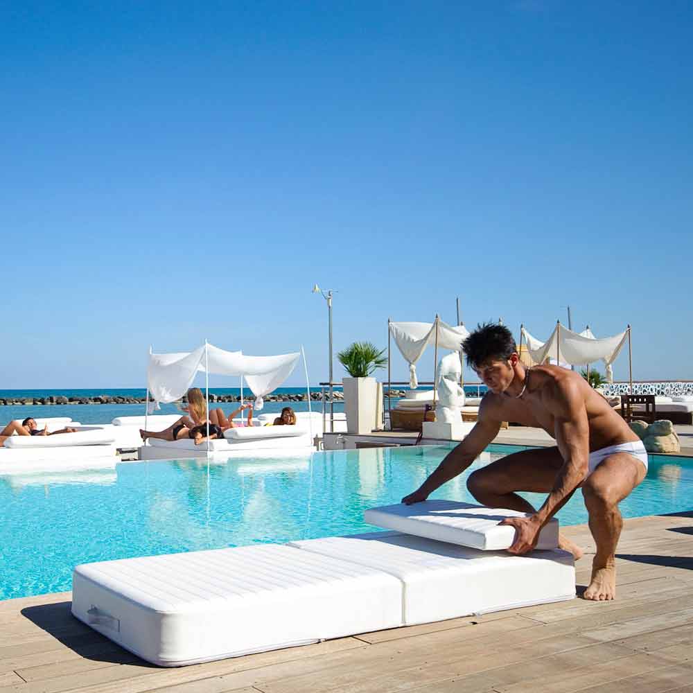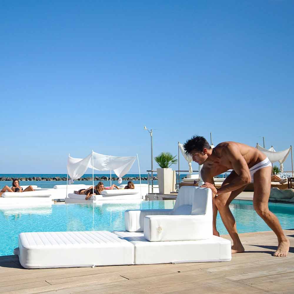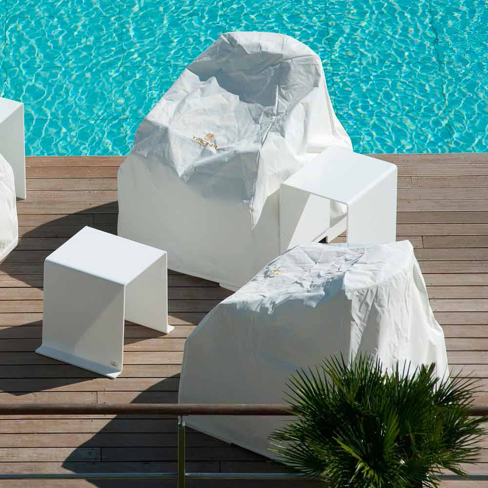Trona Luxury is a unique armchair which can be used both as a poolside armchair and a floating pool lounger. It is made of white eco-friendly nautica faux leather and EPS. This kind of faux leather is designed for outdoors and it is certified, water-resistant and fireproof. The outdoor chair Trona is completely cutted and hand-sewn in Italy.