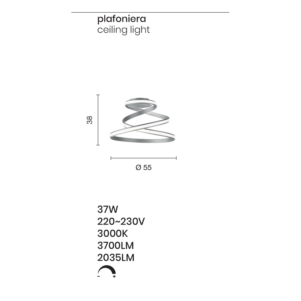 Ceiling light with white painted metal structure complete with LED light source . A dynamic and modern design capable of recreating the sensation of a spinning ribbon, thus enriching the value and aesthetics of the product. This sensation of movement becomes its strong point and allows it to gain the centre of attention within domestic or contract environments with a contemporary and avant-garde style. Modern LED technology also ensures quality lighting, completing the lamp and making it an optimal complement for those looking for functionality and design in a single product.