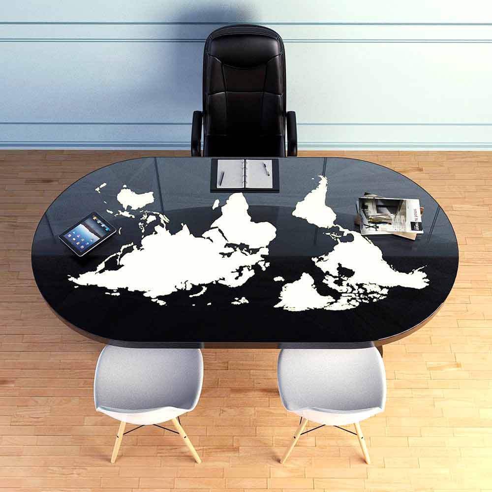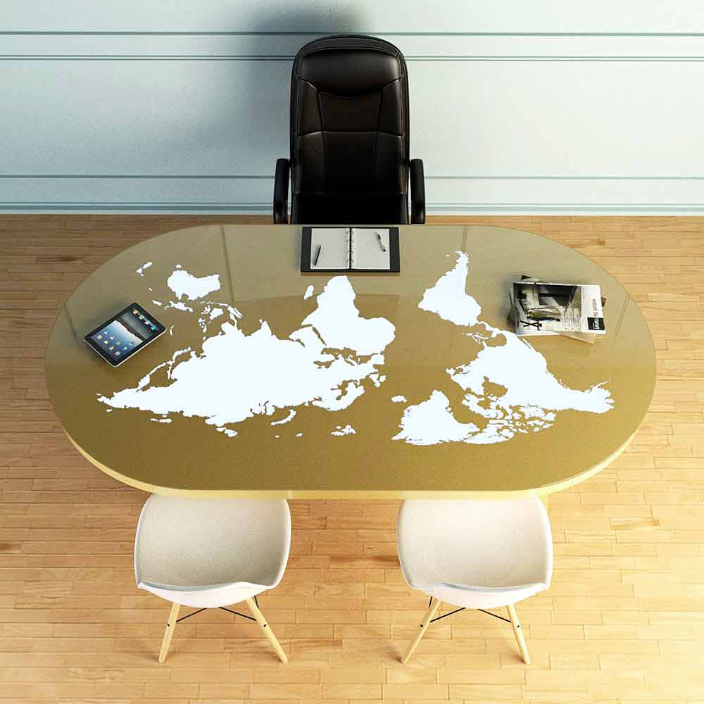 Pontida is a desk table with an ultramodern design; made of Solid Surface® and a glass top where the entire world is represented which, thanks to the presence of LEDs, lights up and changes colour at your pleasure.