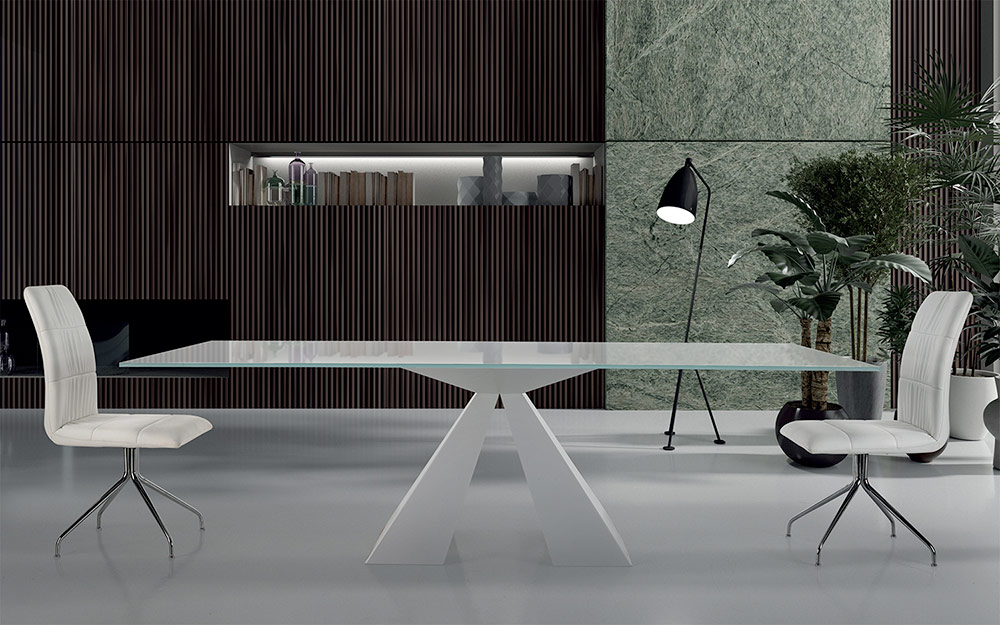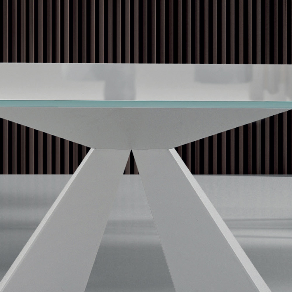 Modern rectangular table handcrafted in Italy in tempered glass and white steel base.