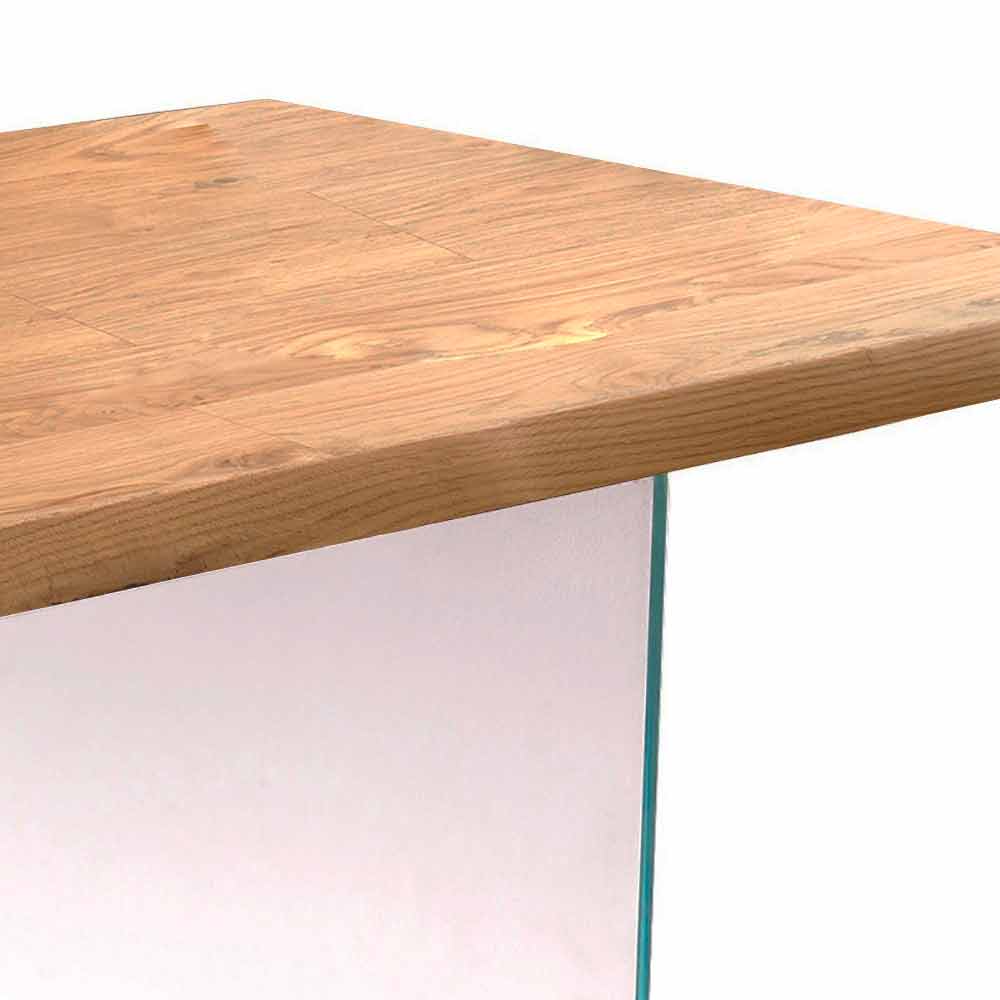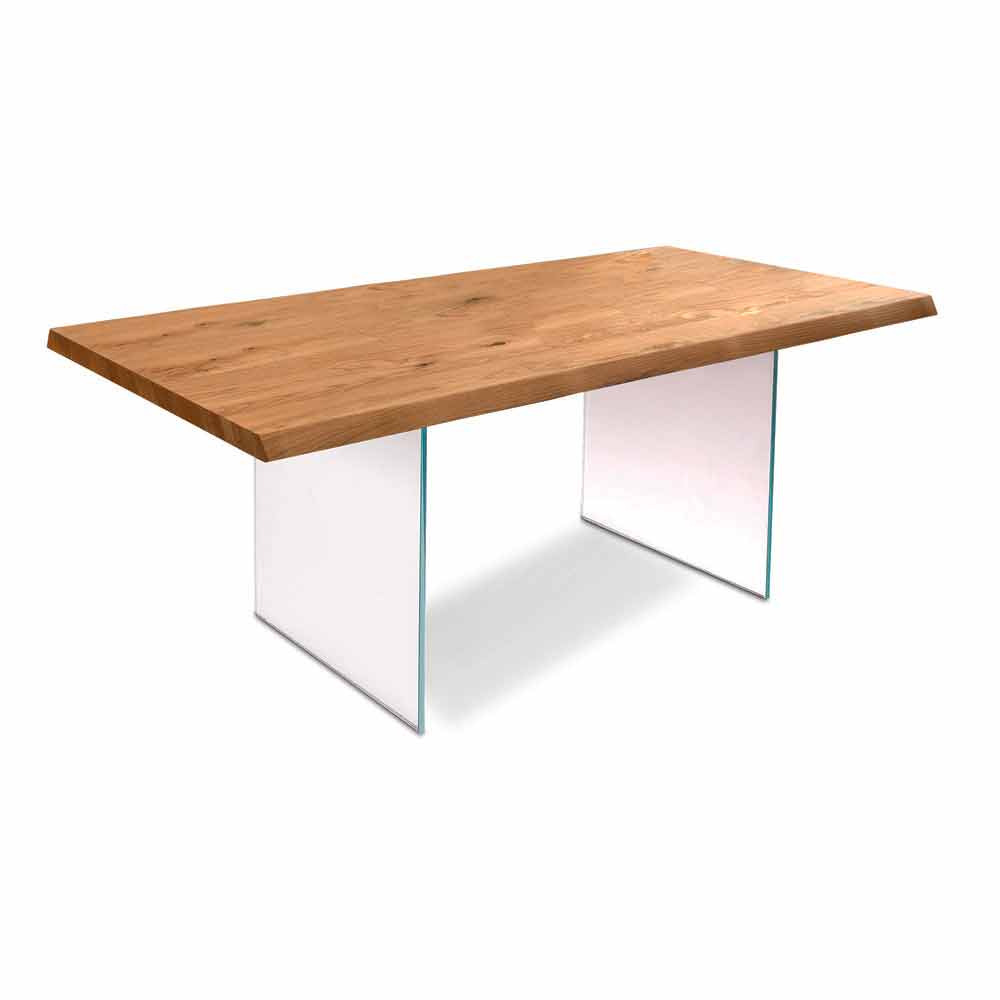 The Nico table is characterized by a design played on the contrast between different materials such as wood and glass. The base is in fact made of 12 mm extra clear tempered glass, while the top is in raw oak veneer with solid and debarked edge.