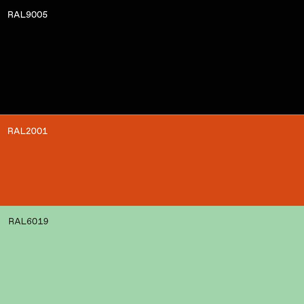 Finish: legs in orange RAL2001 + aqua green cross RAL6019 + scratch-resistant top in black RAL9005