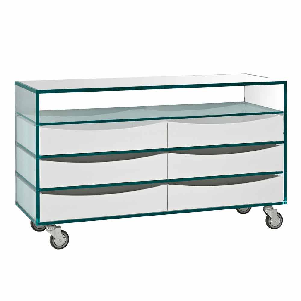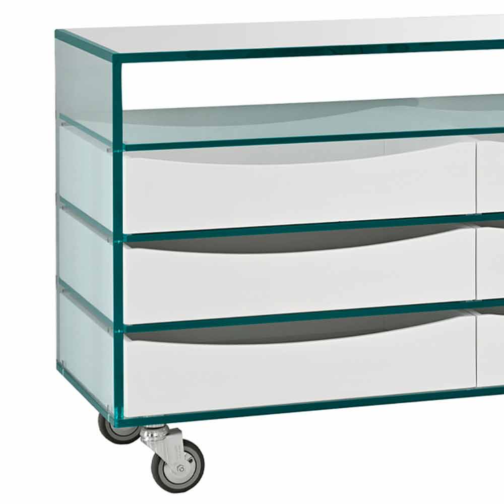 Modern style dresser on wheels in extraclear glass with six drawers in white wood, realized in Italy by hand.