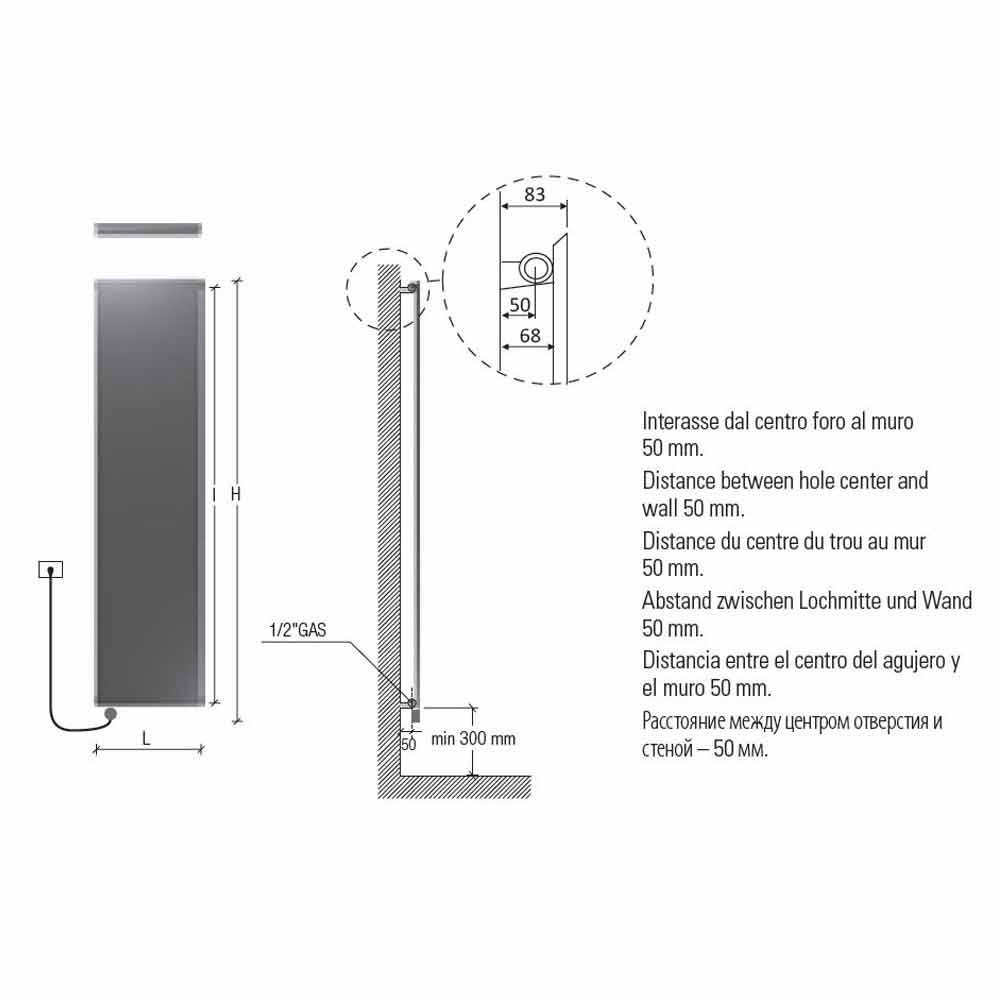 Note that the 110 mm thermostat must be added to the height. White thermostatic box as standard for white radiators; chrome for the colored radiators and stainless steel finishes. Single-phase 230 volt power supply.