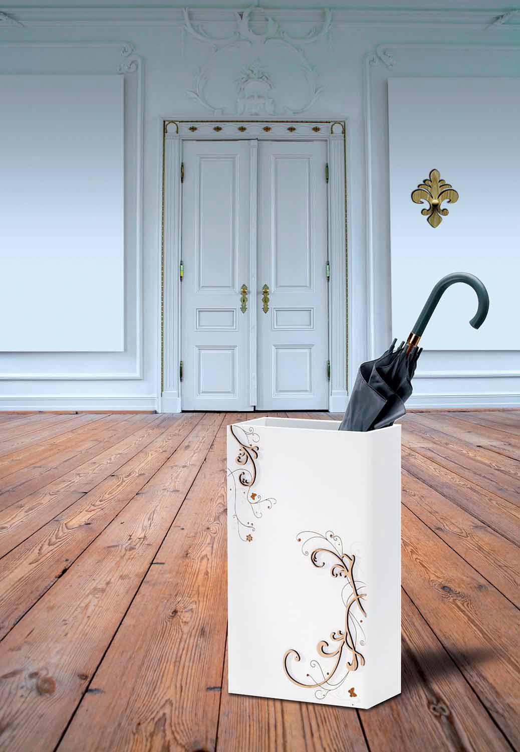 lacquered wood floor umbrella stand with classy decoration applications.