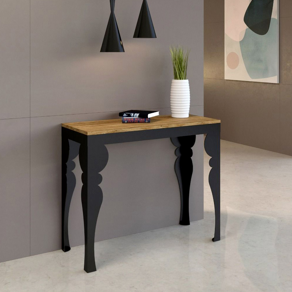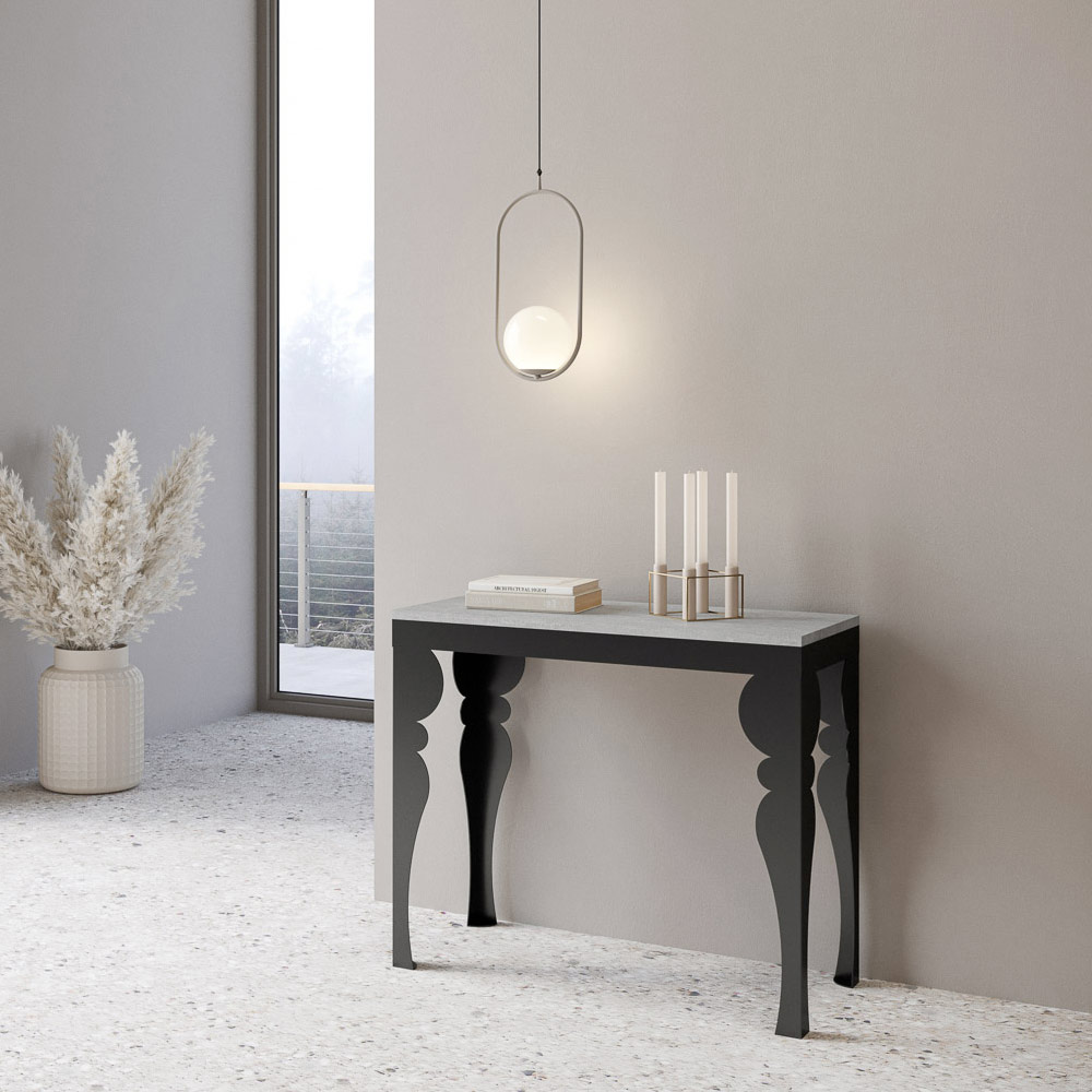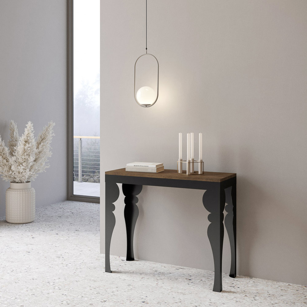The contrast between the anthracite gray of the legs and the wood of the top creates a visually stimulating dialogue, making this piece of furniture a sophisticated choice for any room. Perfect as entrance furniture or as an additional surface in a lounge, the console table transforms with ease, extending to become the centerpiece of a dining room, ready to host memorable moments.