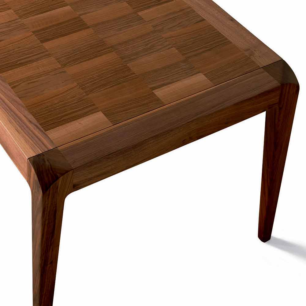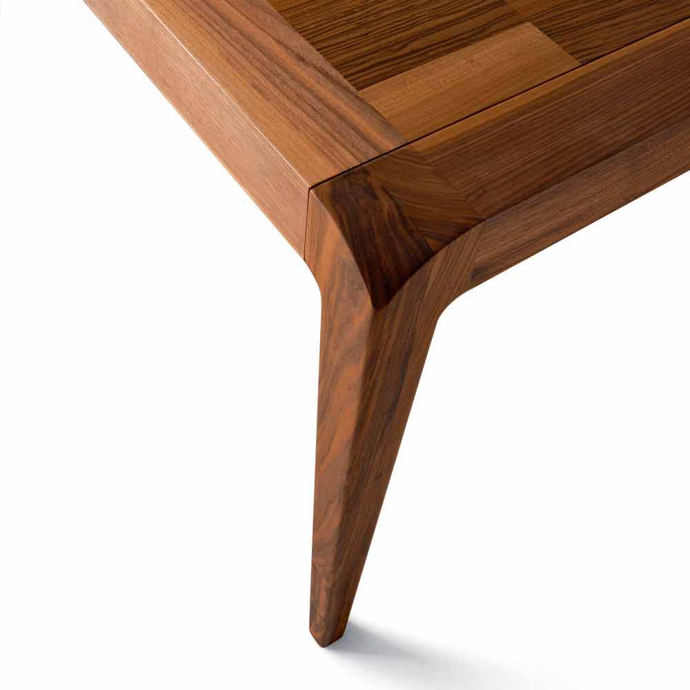 Extendable rectangular table with natural walnut veneered top with inlay. Structure and legs in solid walnut. Extensions with under-side bands. The table stands out for the careful processing of the top, a contemporary inlay that goes well with the curved movement of the legs that do not create angles.