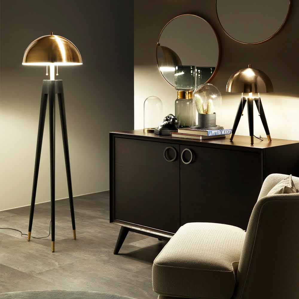 This floor lamp is composed of a black metal structure with a domed brushed brass lampshade that matches the details on the bottom of the 3 support legs, also in brass. The use of these refined taste finishes in combination with a simple and linear design gives life to a furnishing accessory with a strong personality that does not go unnoticed.