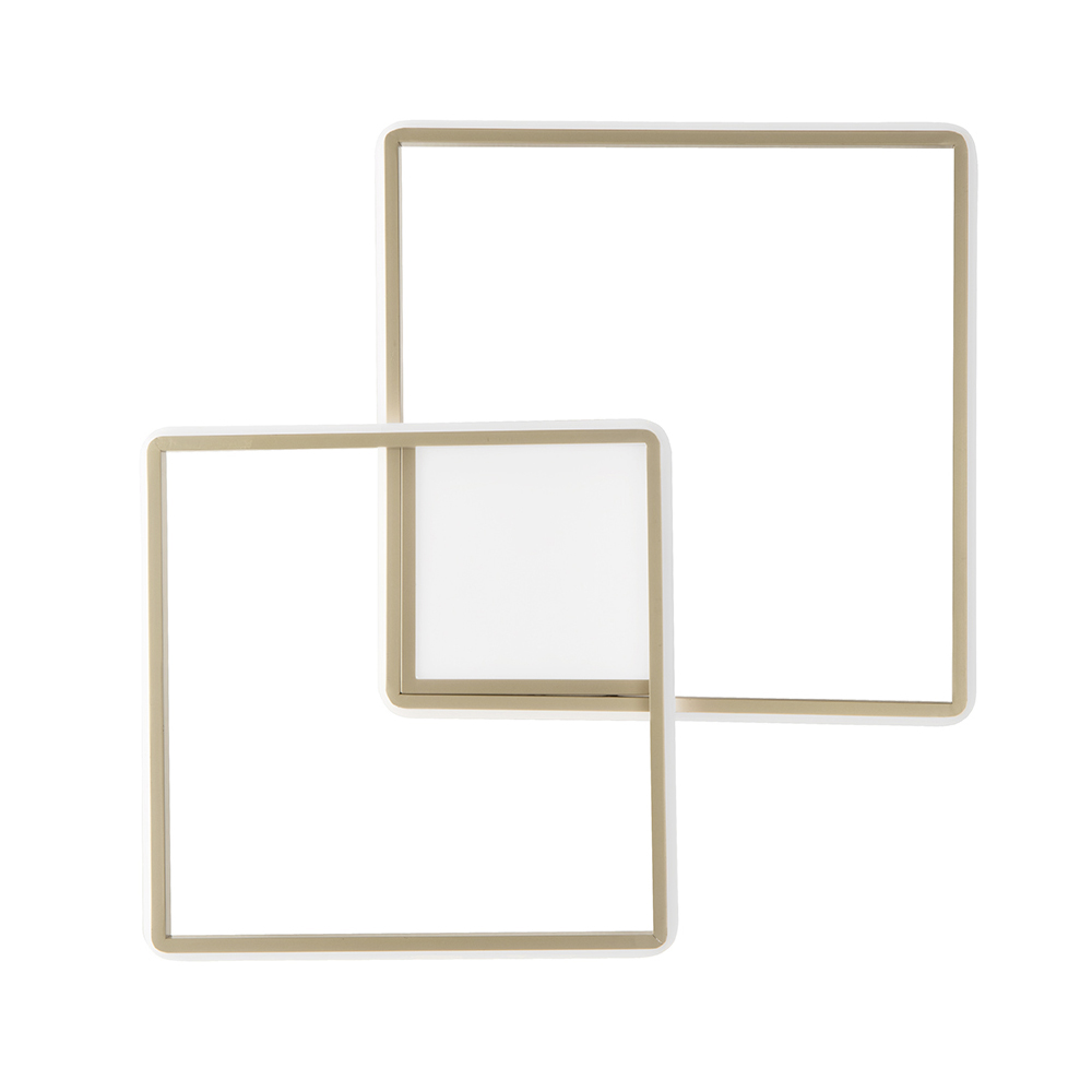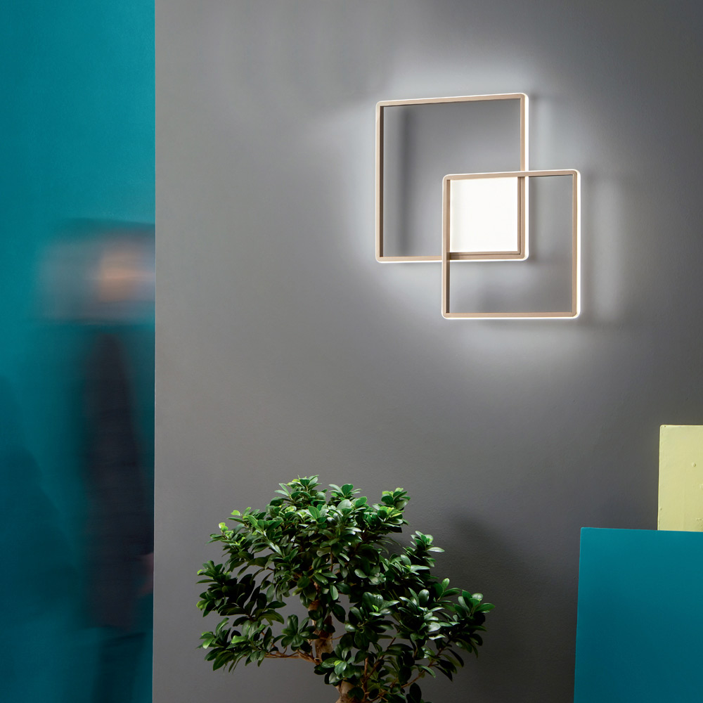 Wall light in gold finish painted metal complete with integrated dimmable LED source . A modern complement whose aesthetics are marked by simple shapes and original, squared lines , conceived and designed to illuminate and furnish domestic spaces such as entrances, corridors, bedrooms, living areas or kitchens in an exclusive and elegant way. The refined golden finish underlines its refined design and makes it a one-of-a-kind product for a result suitable for those seeking aesthetic perfection of geometric shapes even in their home furnishings. Its shape also makes it installable on the ceiling , becoming a real ceiling light and thus increasing its functional side and versatility.