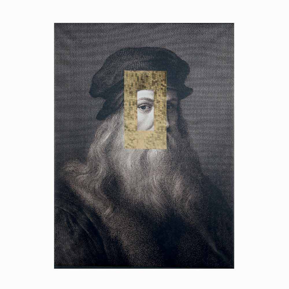 Modern wall painting made in Italy in wood with printed canvas depicting Leonardo da Vinci and enriched with a rectangular decoration in gold leaf . The elegance of the design meets the refinement of the materials to give life to an original complement that can complete the home furnishings in an exclusive way and with a strong modern personality . An extremely original furnishing idea capable of enriching any space in the house with personality and elegance, bringing with it all the liveliness of creative prints and new techniques and proving to be a perfect solution for those looking for a creative and eccentric style for the walls of their home.