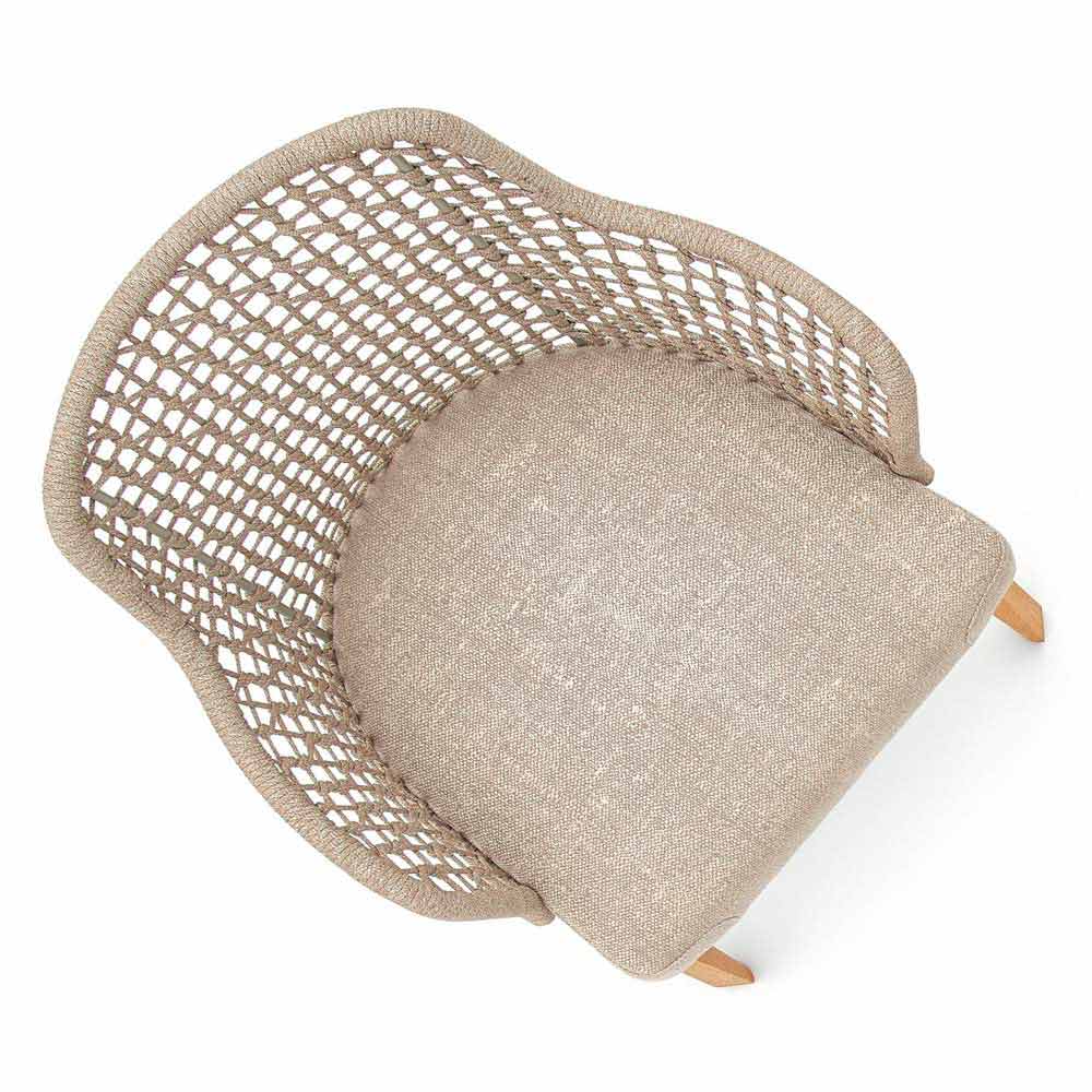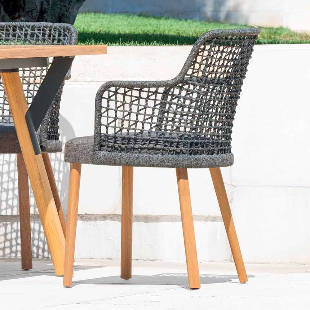 Emma is a garden armchair characterized by a hand-woven synthetic fibre structure with beige or dark gray powder-coated aluminium frame.