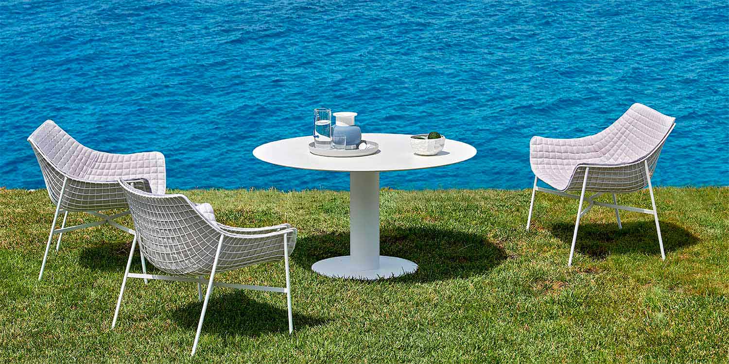 Summer Set is a fabulous outdoor armchair, characterized by a load-bearing structure in powder-coated steel with a choice of white or black colours; seat and back cushion in quilted fabric.