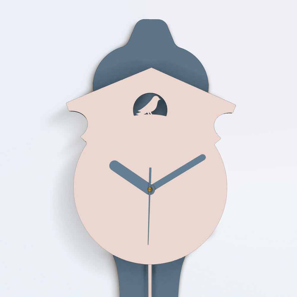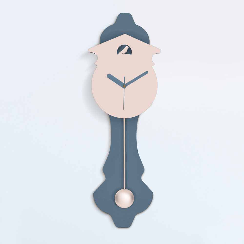 Gray and pink wall pendulum clock, modern design in laser-cut wood, made in Italy.
