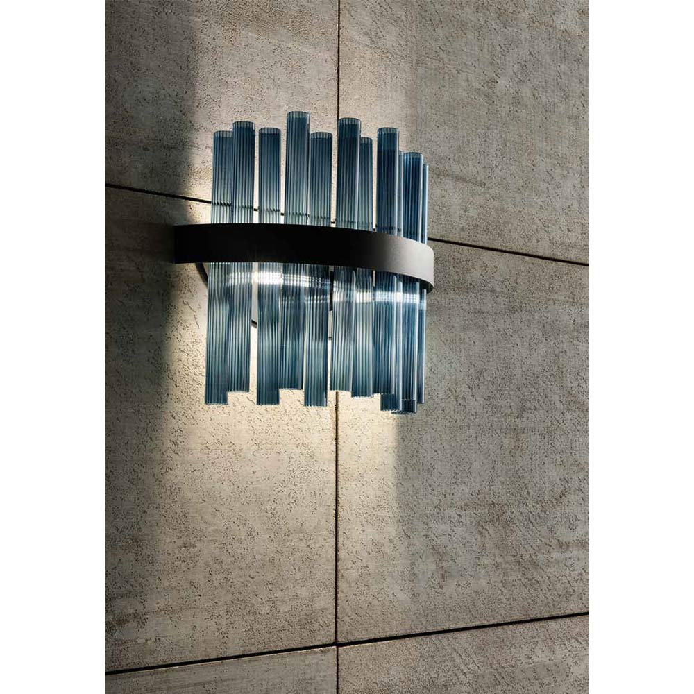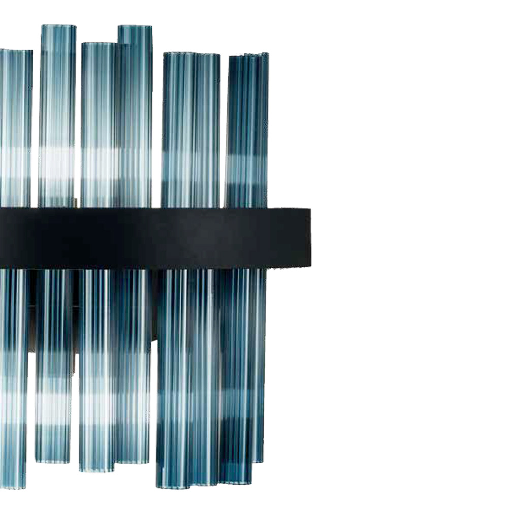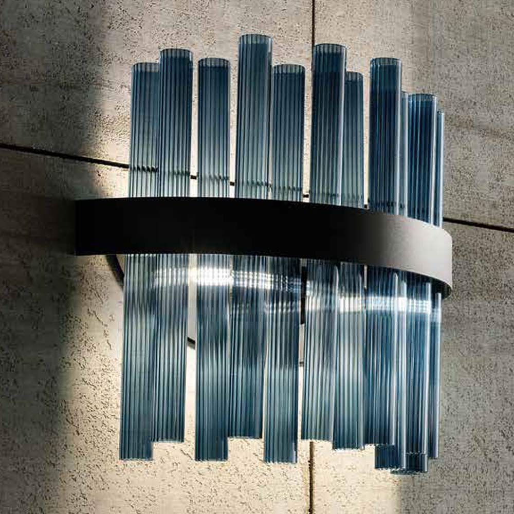 The applique with a modern and refined design is a luxury lighting accessory entirely handmade in Italy in blown striped glass and metal structure produced and painted by hand.