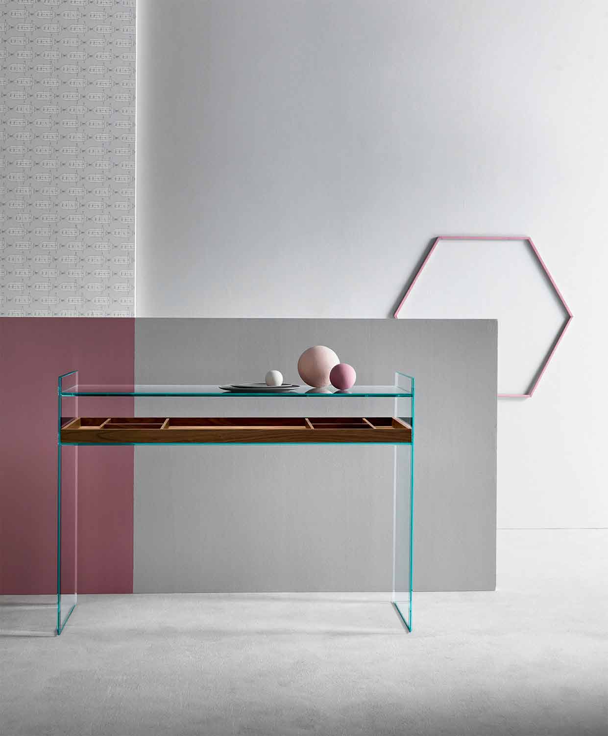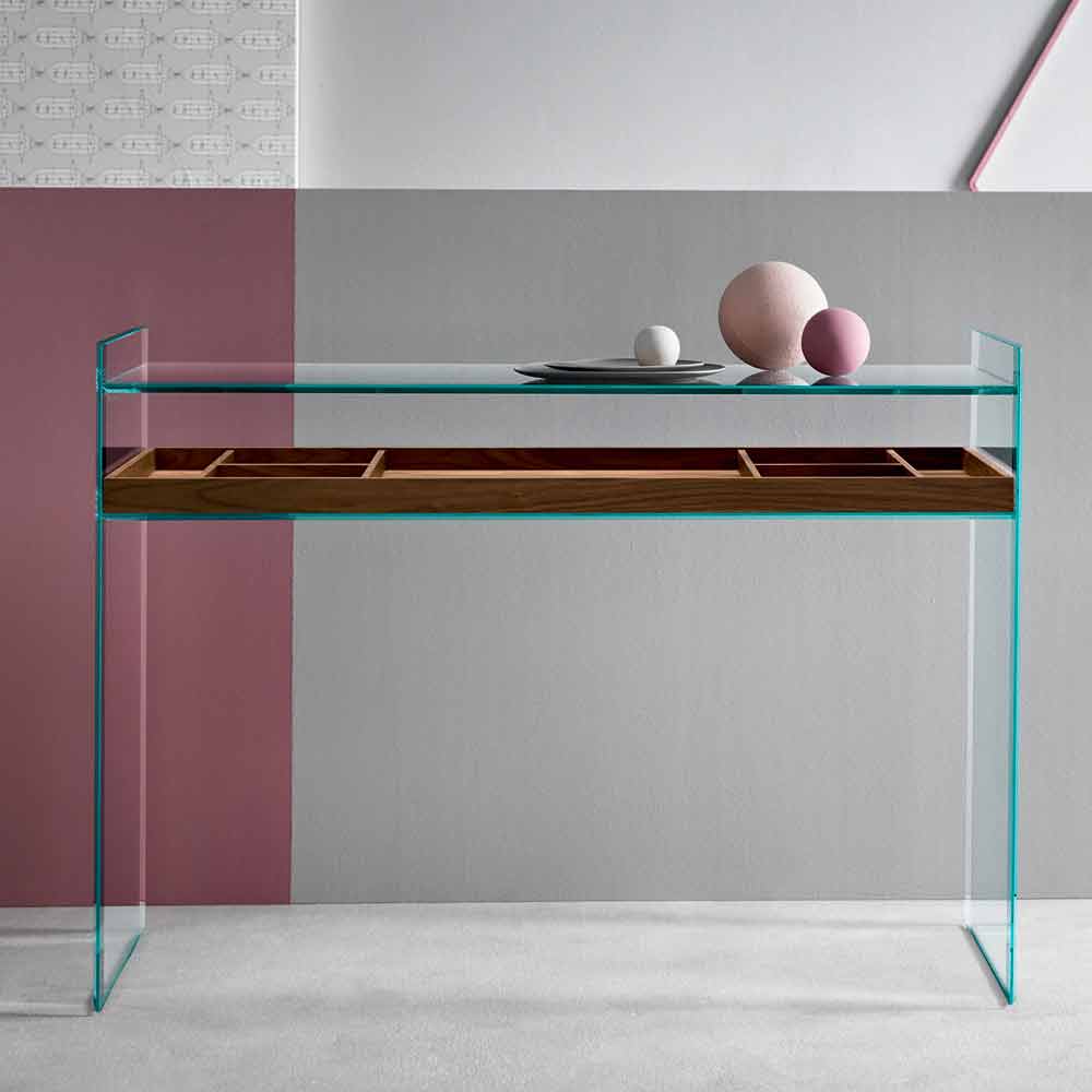 Modern consolle desk realized in Italy by hand in extraclear glass with tray in solid wood.