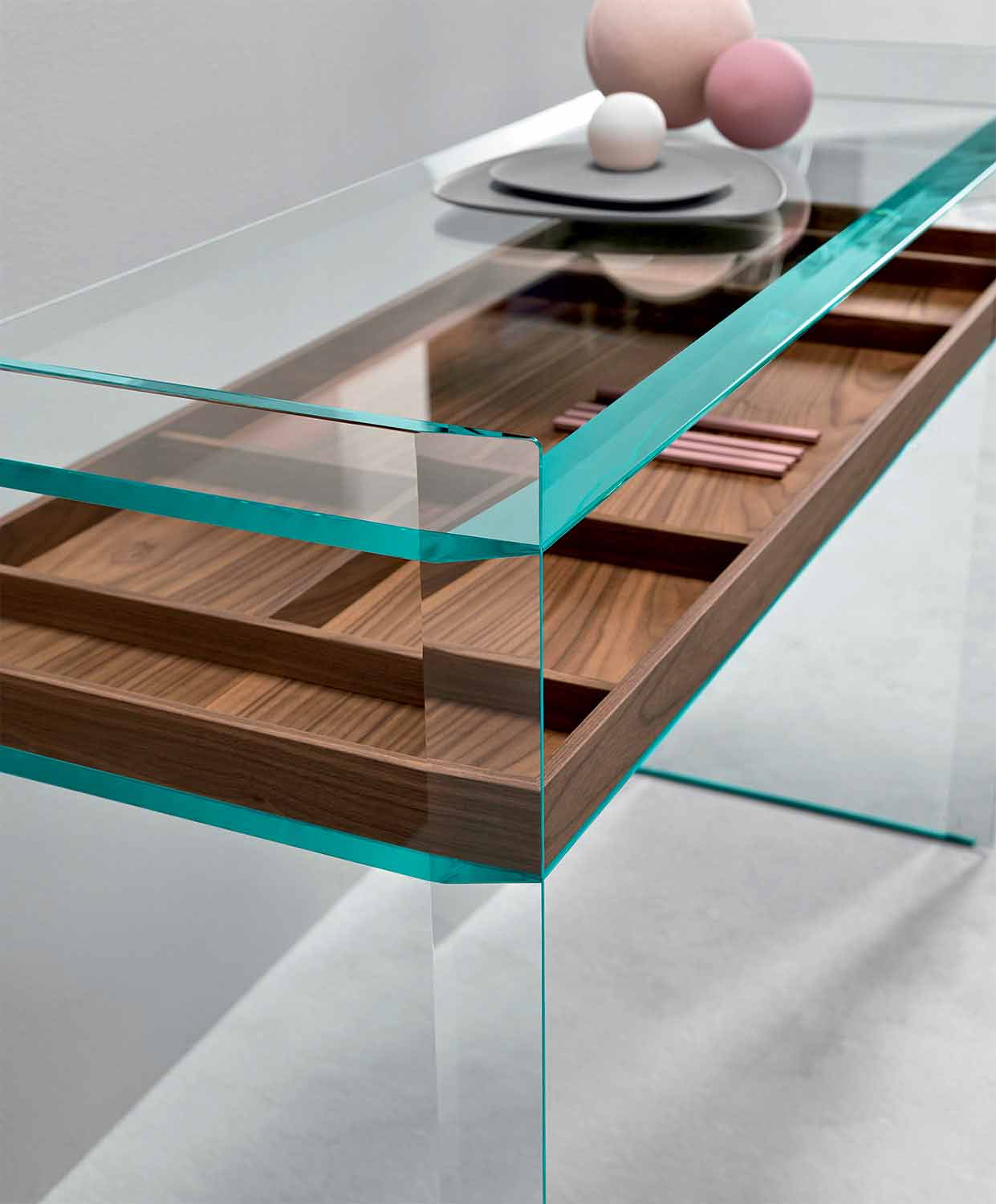 Fully made in extraclear glass (thickness 15 mm) with beveled 5 cm edges; to complete his beauty and functionality it comes with a tray in canaletto walnut solid wood.
