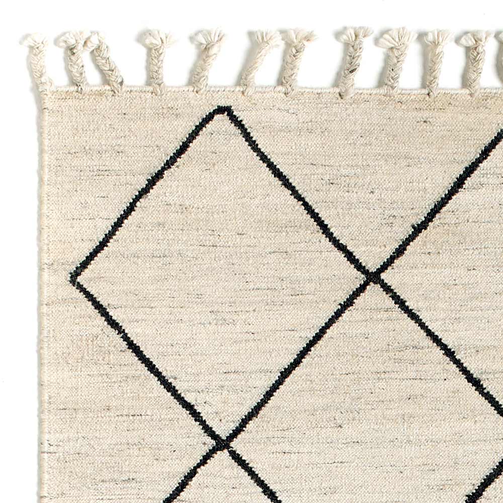 geometric pattern in shades of black that gives modernity together with the fringes that cover the two shorter sides of the rug. The materials and techniques used make it possible to obtain a high quality final product capable of drawing attention to itself, making every environment unique.