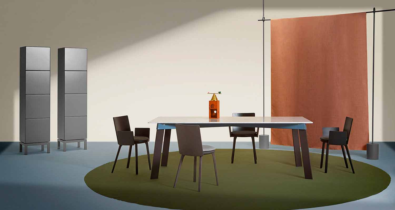 Original and functional , the fork design of the steel ends allows the insertion of the legs, also in steel, with a simple assembly system. A technical and practical detail that also becomes aesthetic: the joint screws and the choice of matching or contrasting colours highlight it, creating an
