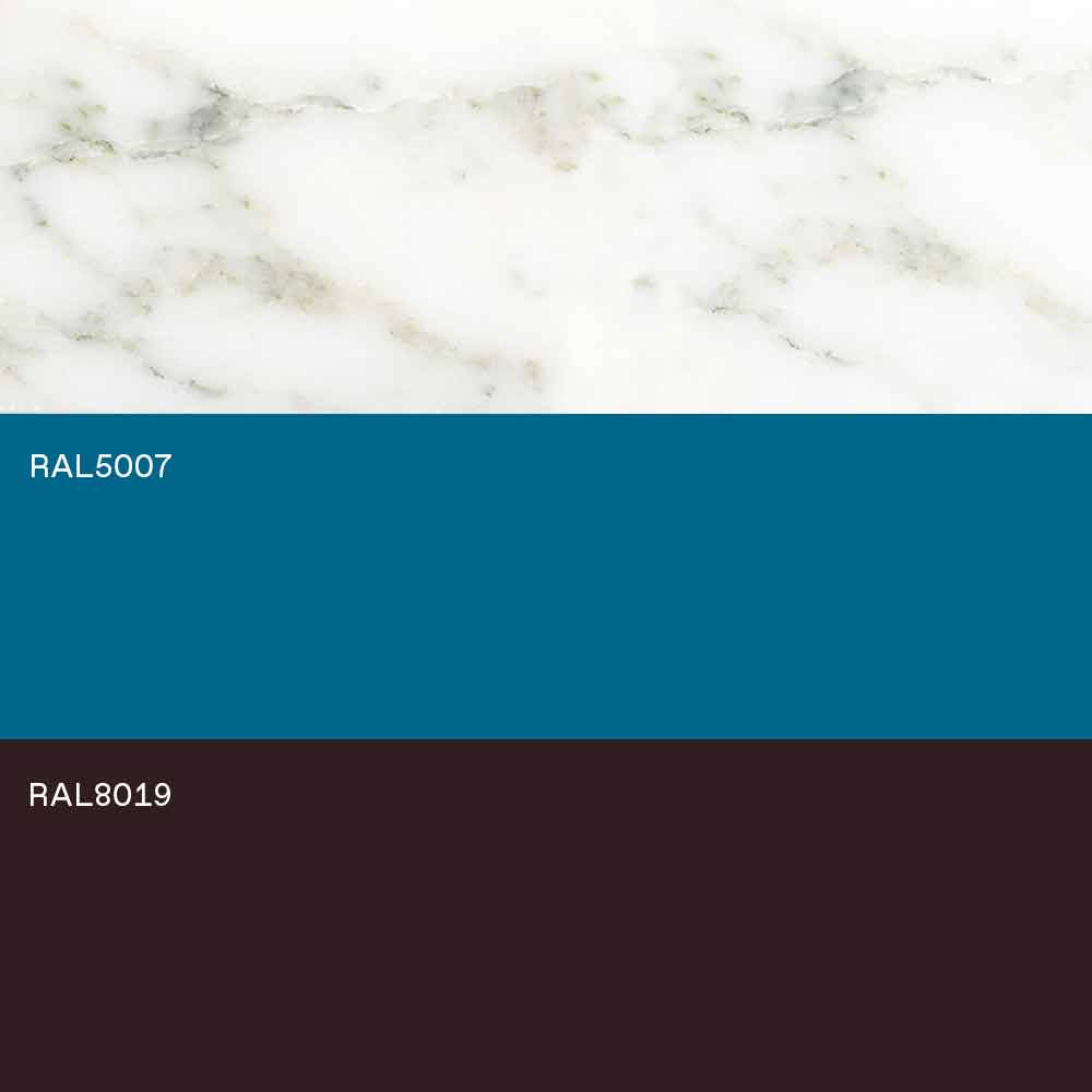Finish : coffee RAL8019 + cross in light blue RAL5007 + top in white Michelangelo marble