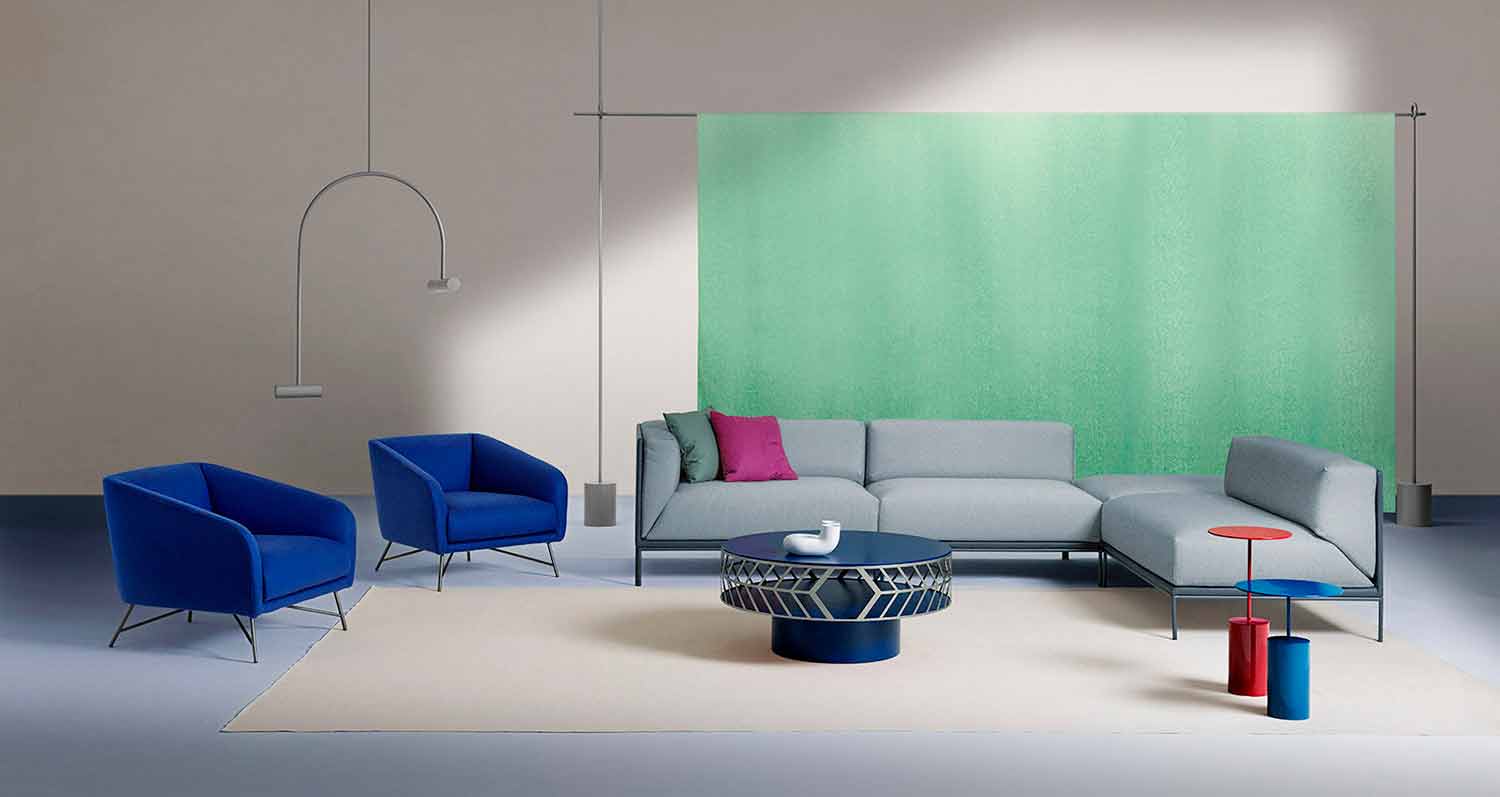 coffee table , made up of two overlapping cylindrical volumes of different sizes, enhances the
