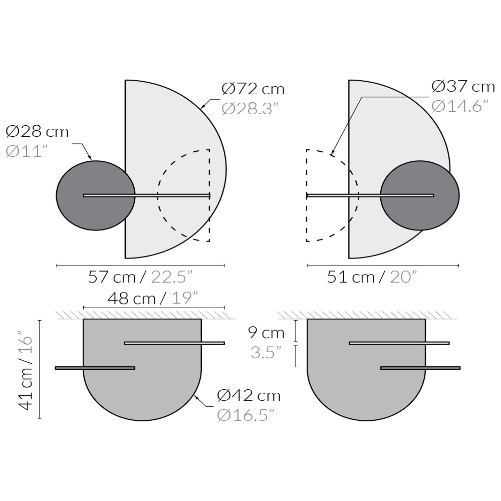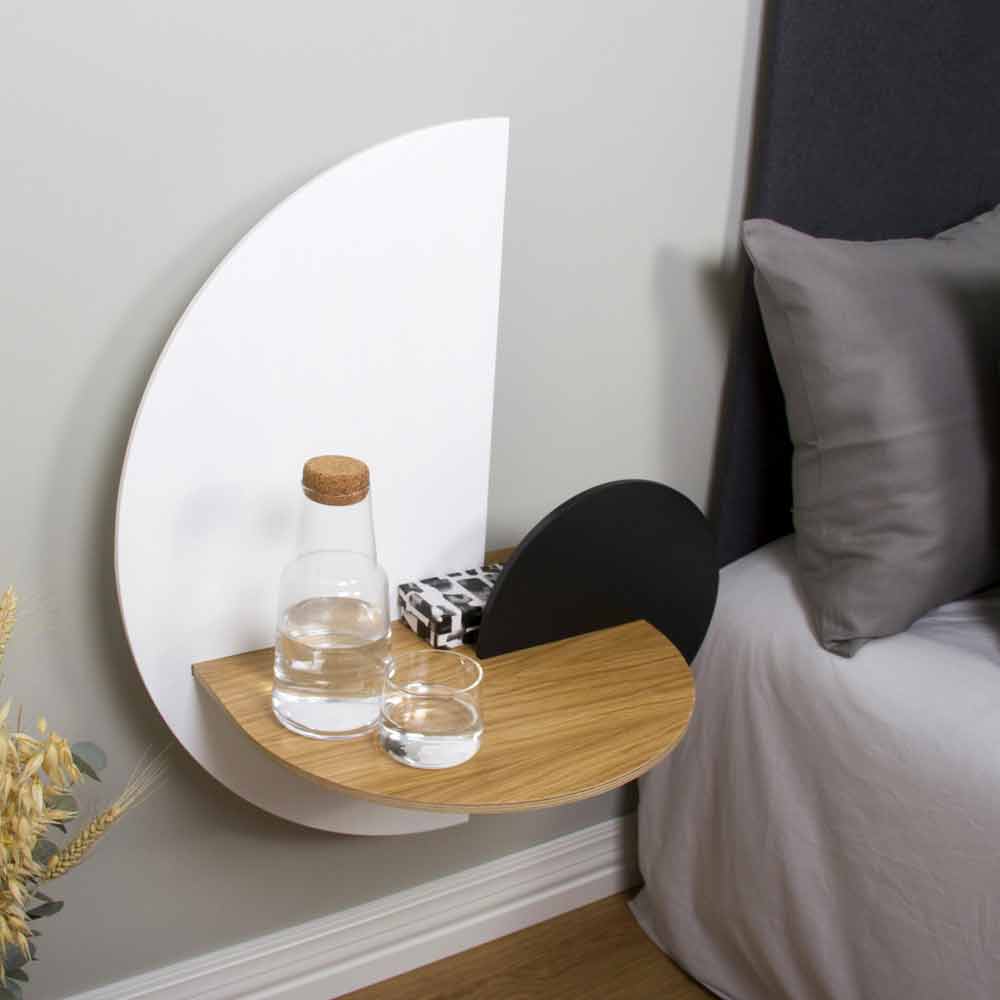 What characterises this bedside table is its innovative and original design capable of revolutionizing the furnishing of any bedroom that needs a touch of personality and elegance . Its structure has simple geometric lines that give the product uniqueness and harmony between the shapes. Its structure is made through the use of 3 plywood panels, one of which in oak finish fixed to the wall which acts as a real support surface and two in black and white stained ash finish which are mounted on it and which allow up to 8 different configurations thus allowing you to obtain a product that can be customized according to your needs.