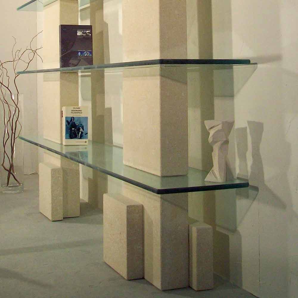 The bookcase Poplia is entirely made in Italy. It is made of Vicenza natural stone and it is provided with 4 crystal shelves with rough edges. The structure is composed of 35 cm height modular elements. An inner structure nsure stability to the composition.