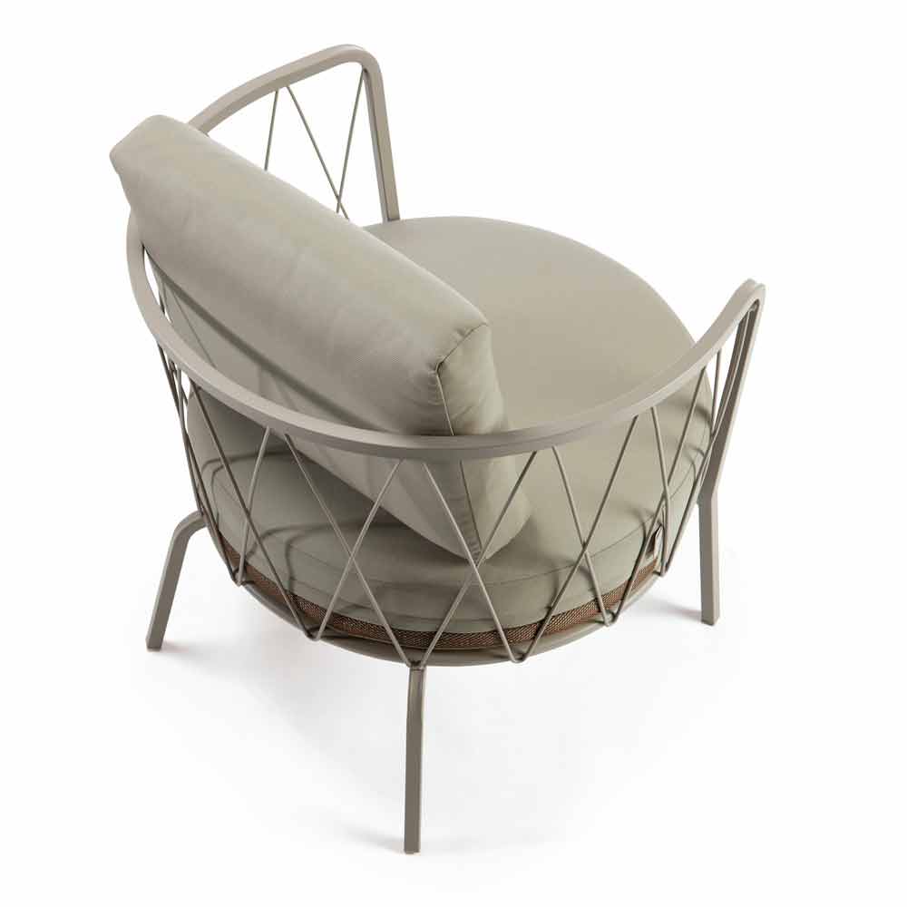high comfort . Thanks to the modern design and the comfort of the cushions covered in 100% dyed acrylic fabric resistant to stains, mould and light, this armchair is ideal for private environments such as gardens and terraces but also in bars and restaurants where they can give personality.
