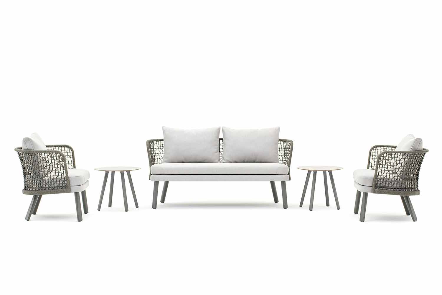Emma is an exciting outdoor sofa characterized by a structure in synthetic fibre hand-woven with a dark gray powder coated aluminium frame.