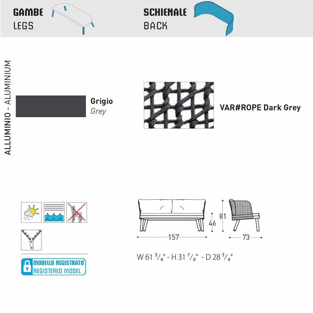 It also comes with legs in grey painted aluminium and a seat padded with Dryfeel rubber covered in fabric.