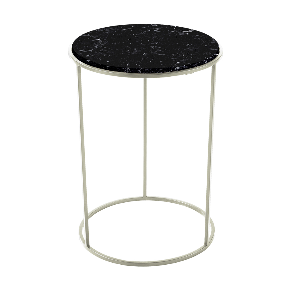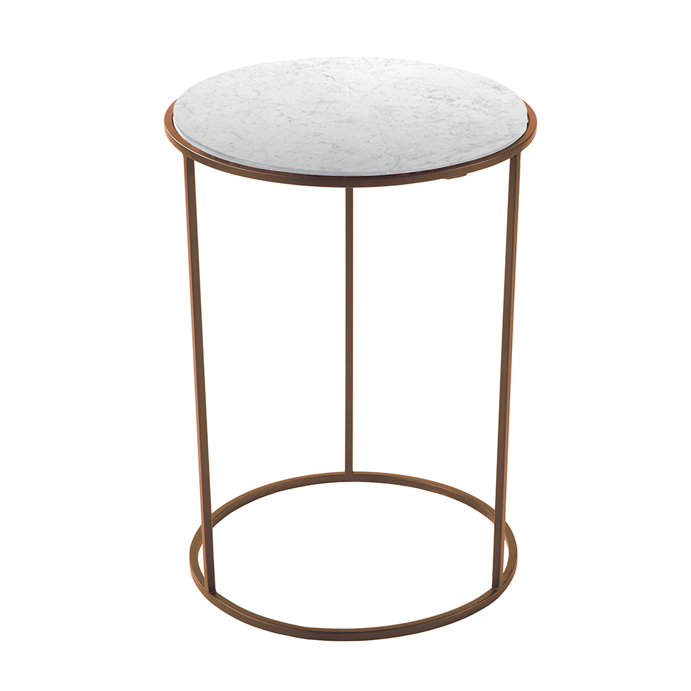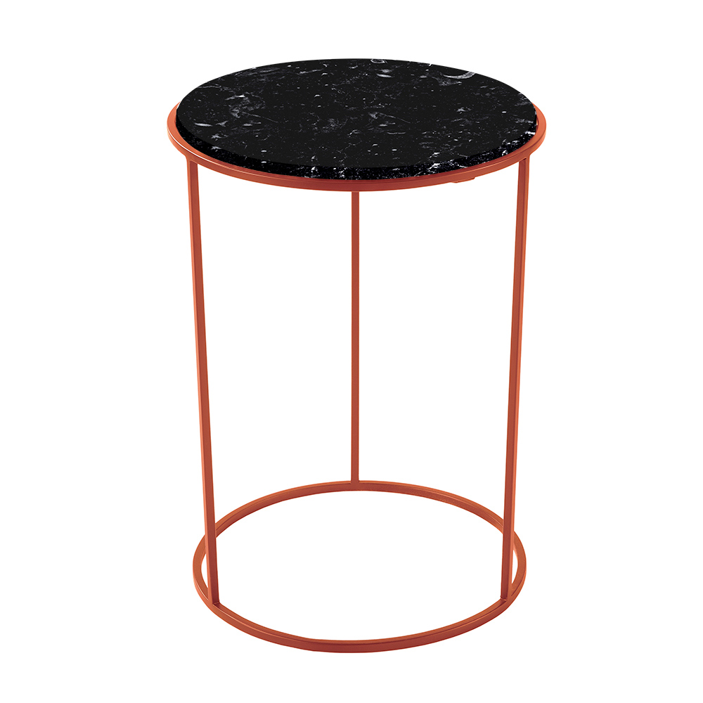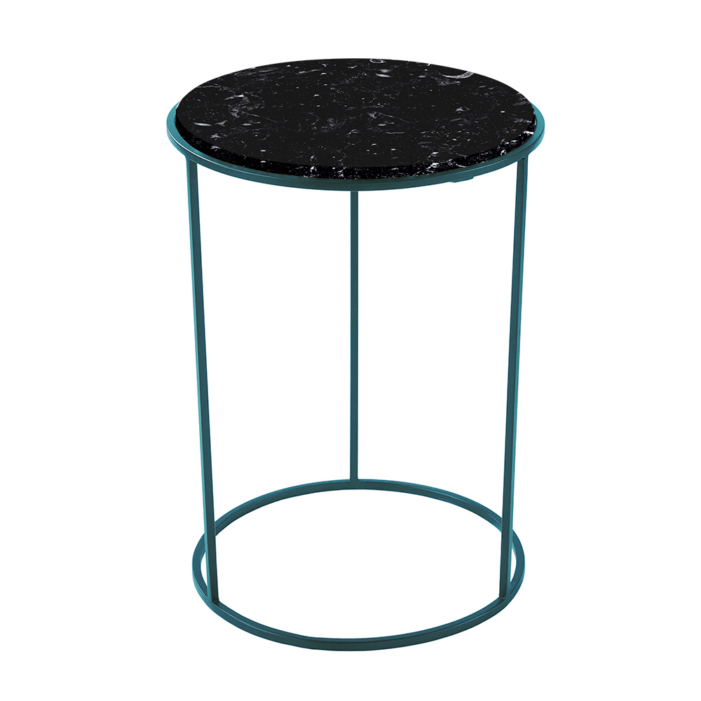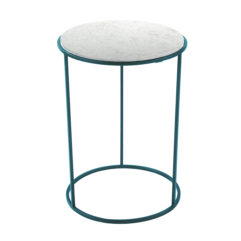 round coffee table with opaque marble top, available in three different variants, has minimal and essential queues. The