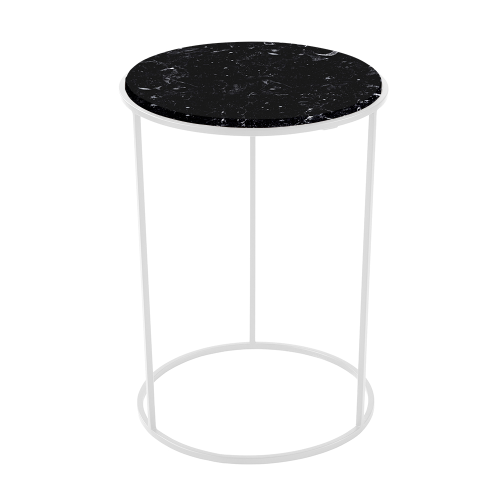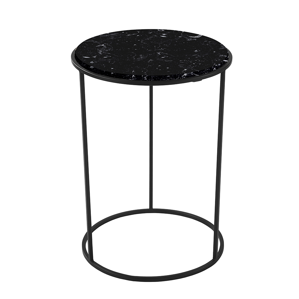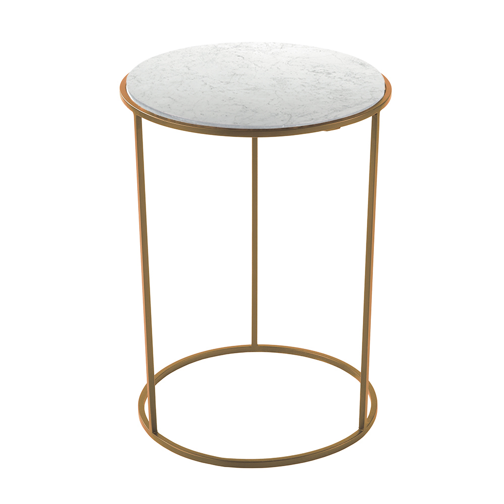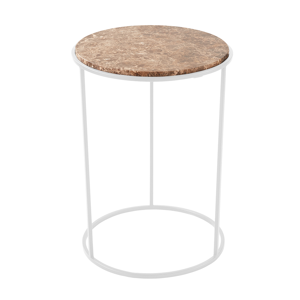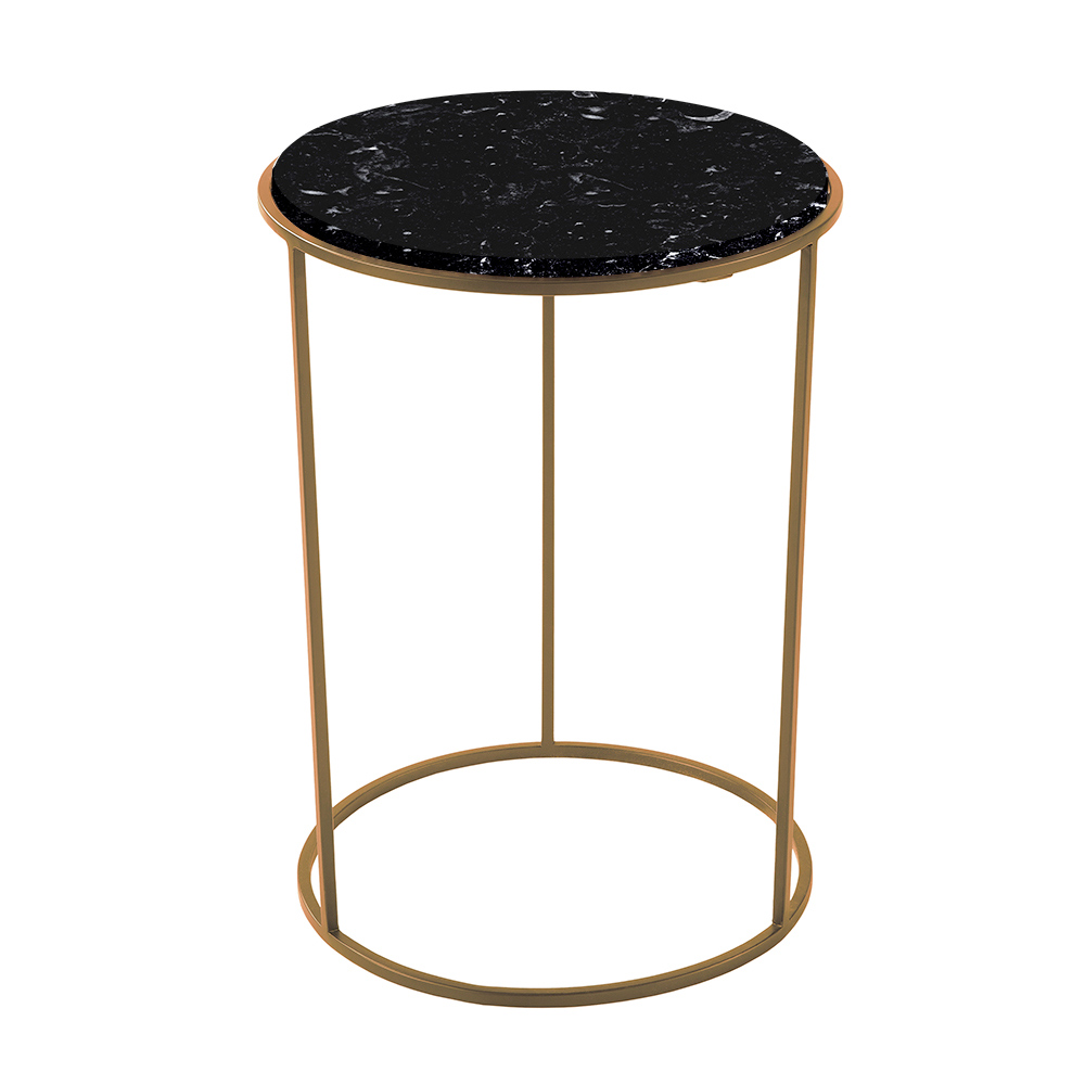 round coffee table with opaque marble top, available in three different variants, has minimal and essential queues. The