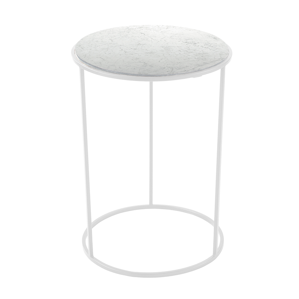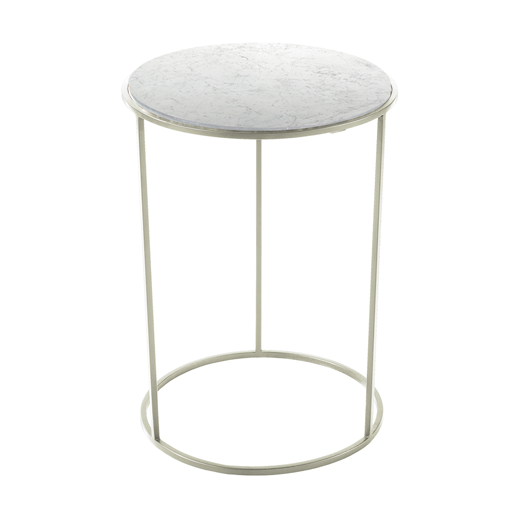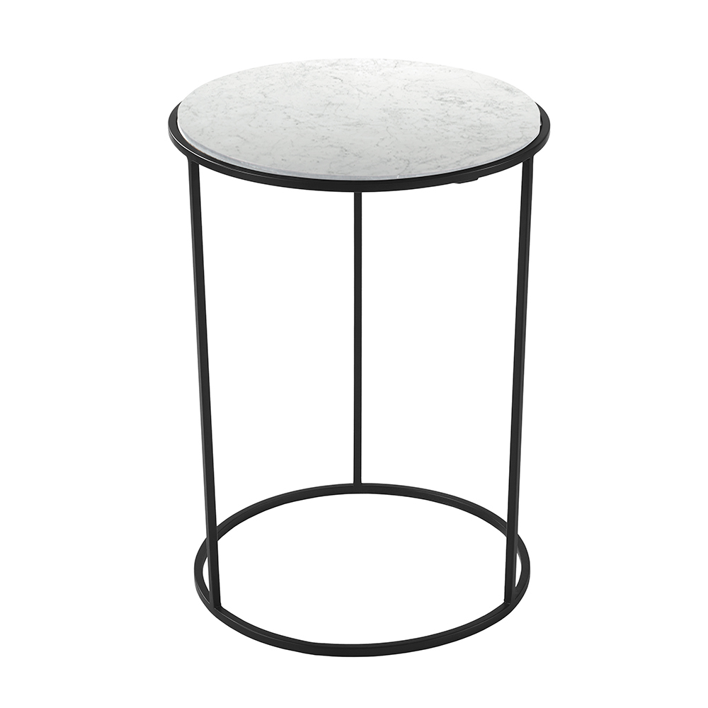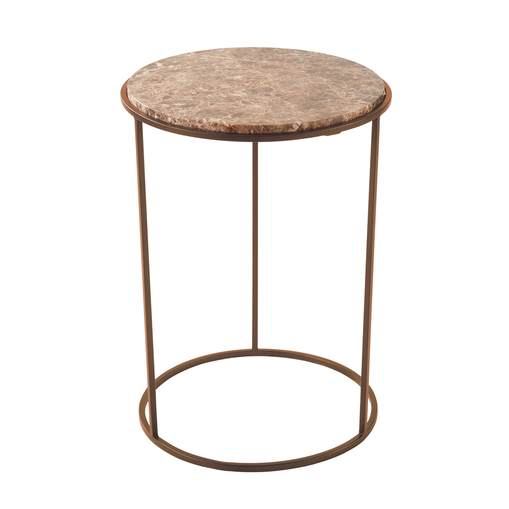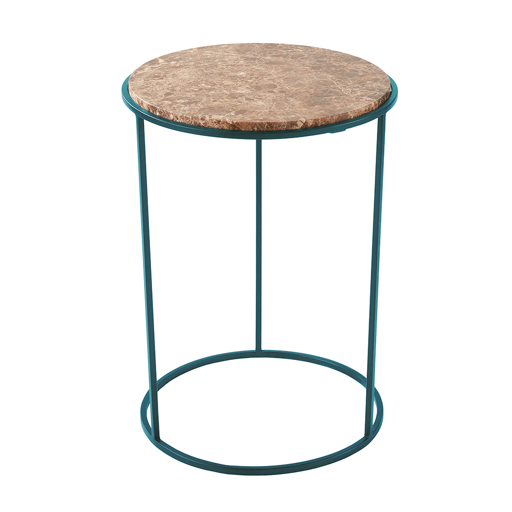 round coffee table with opaque marble top, available in three different variants, has minimal and essential queues. The