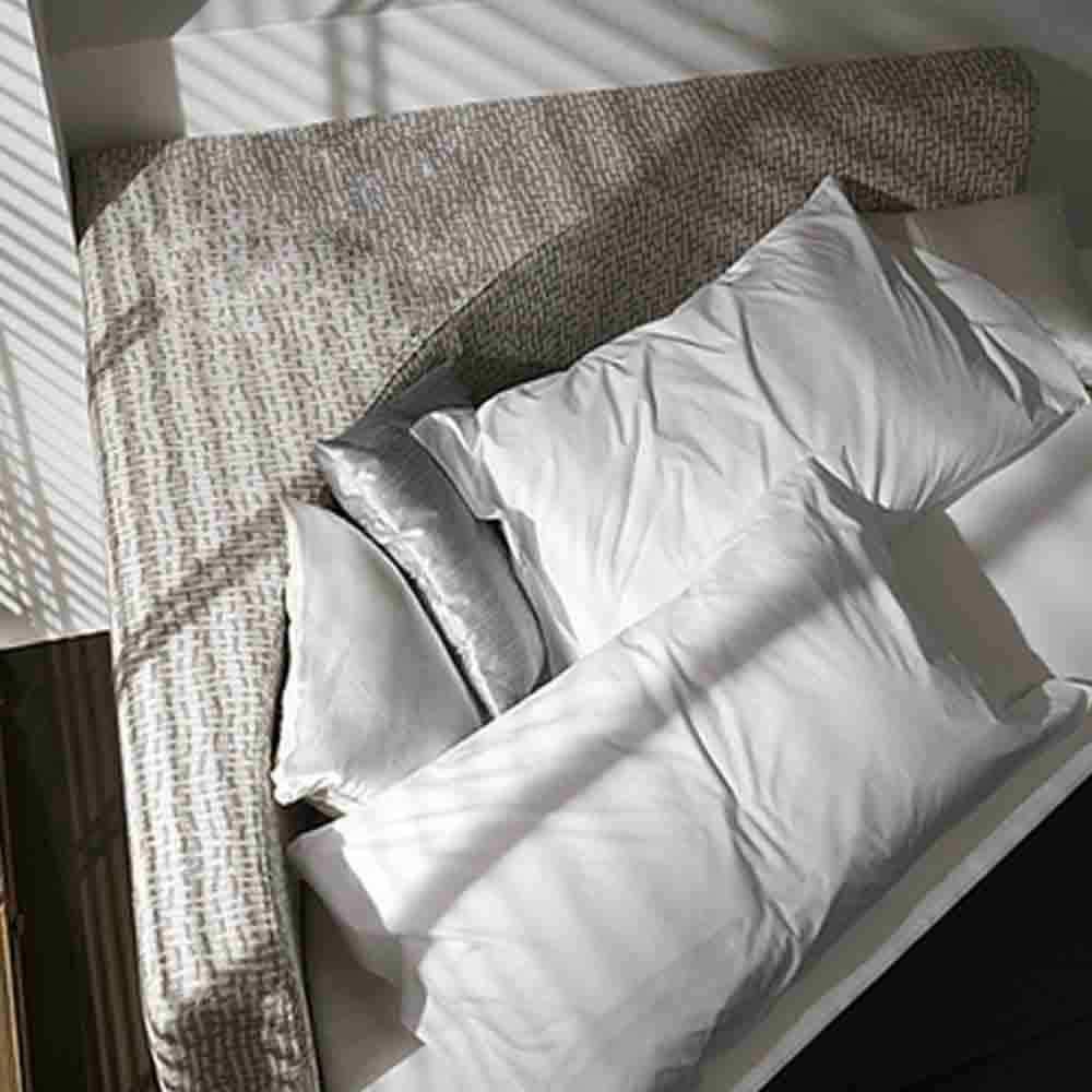 Round double bed with a unique and refined design characterized by the angular shape of the headboard that allows it to be used both in the centre and in the corner of the room. It is in fact finished on all sides.