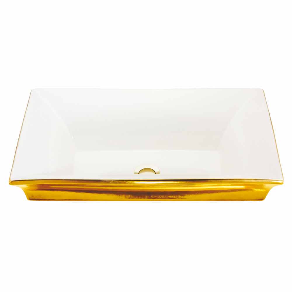 Semi-recessed washbasin handmade in Italy in fire clay with glossy white interior and exterior finished in 24 carat gold.