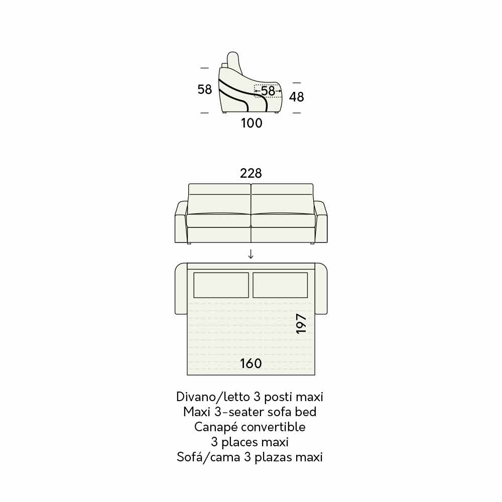 - L 228 x P 100 x H 104 cm (mattress: L 160 x P 197 x H 14 cm).