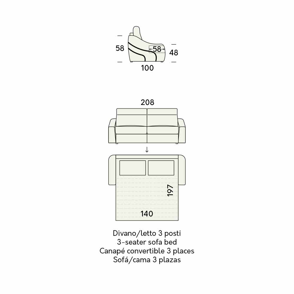 - L 208 x P 100 x H 104 cm (mattress: L 140 x P 197 x H 14 cm);