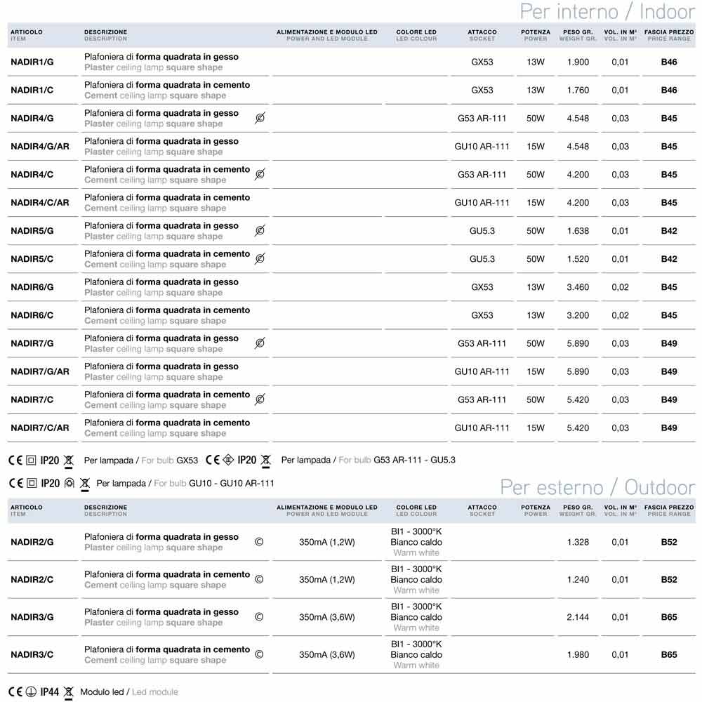 Modern square shape ceiling light Nadir by Aldo Bernardi, available in the concrete or plaster version.