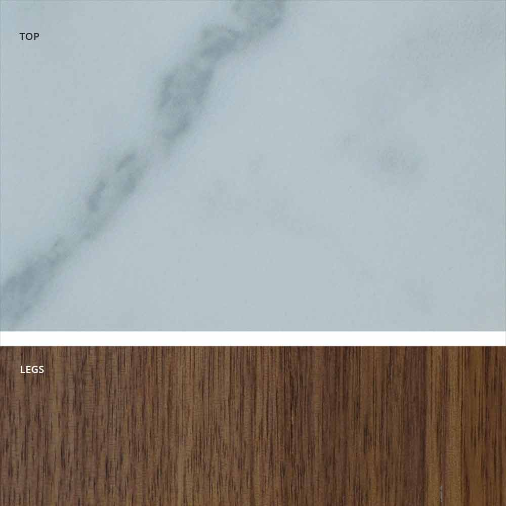 - base made up of over 70 hand-oiled walnut-colored ash-wood strips and a semi-barrel-shaped top in stoneware with matt statuary white marble.