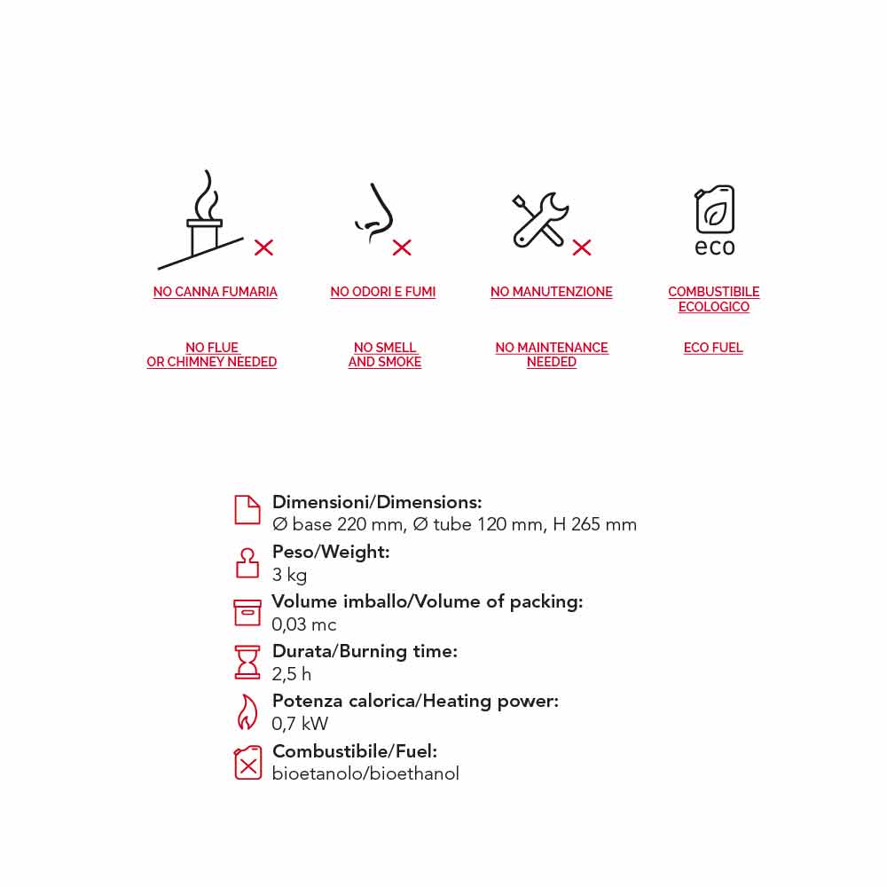 Griff 4 stainless steel bioethanol burner, with a heating power of 0,7 Kw.